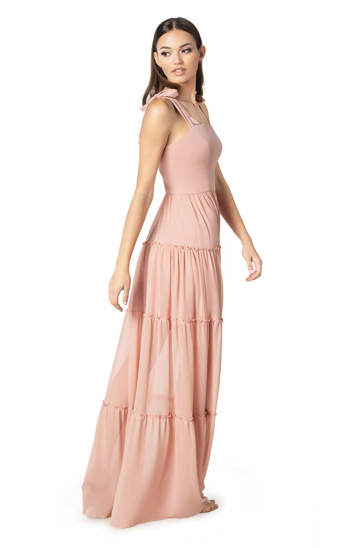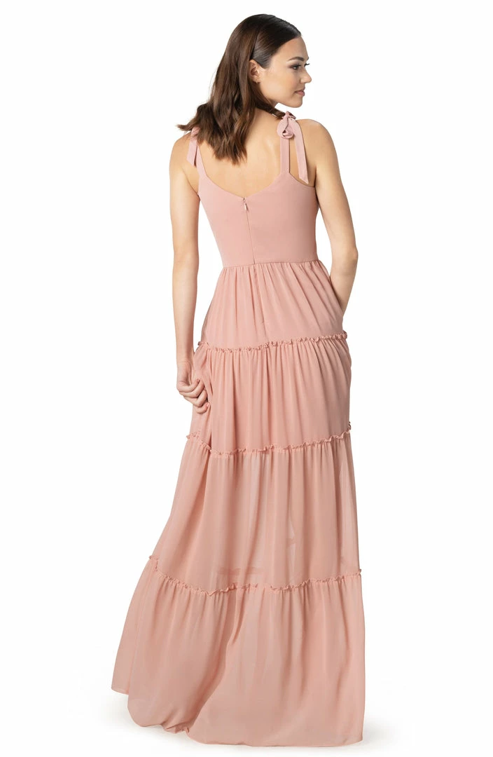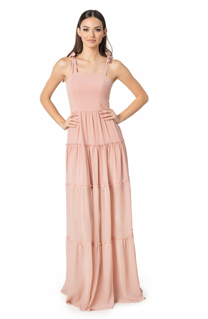 The details of tie shoulder straps and ruffles along the tiered maxi skirt create a timeless essence of elegance.Â