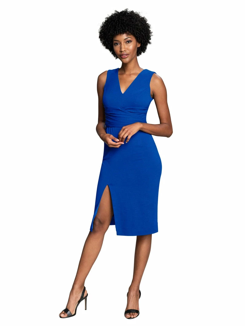 Flattering and sophisticated, this midi-length crepe dress in Electric Blue features a figure-skimming silhouette, alluring side slits, and a tie that wraps around the waist.