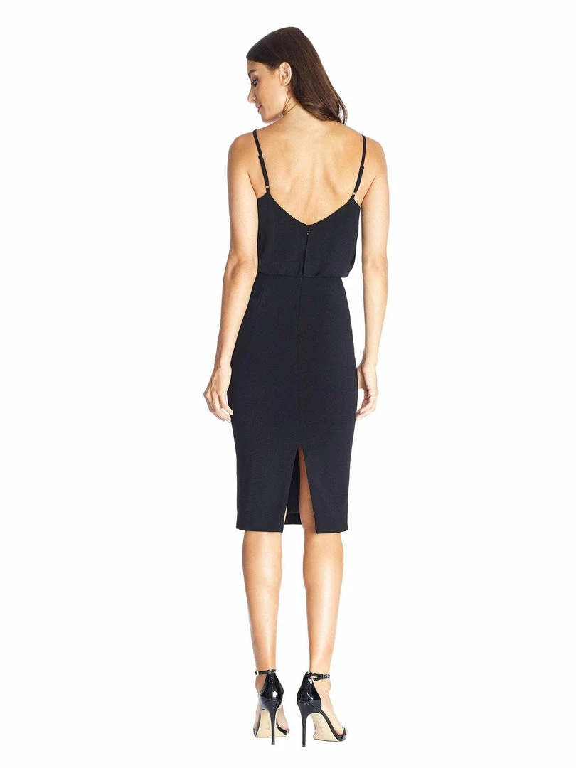 This chic sheath dress in Black features a blouson top with a soft V-neckline and a low V-back. The bubble-hem of the bodice comes in at the waist, and the fitted knee-length pencil skirt creates a slim silhouette. This sleeveless design includes adjustable spaghetti straps and a slit in the back.