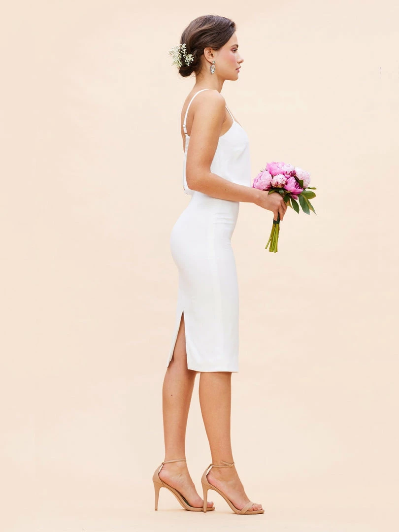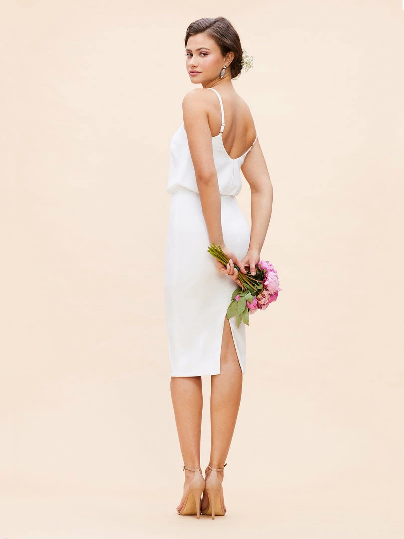 This chic sheath dress in Off-White features a blouson top with a soft V-neckline and a low V-back. The bubble-hem of the bodice comes in at the waist, and the fitted knee-length pencil skirt creates a slim silhouette. This sleeveless design includes adjustable spaghetti straps and a slit in the back.