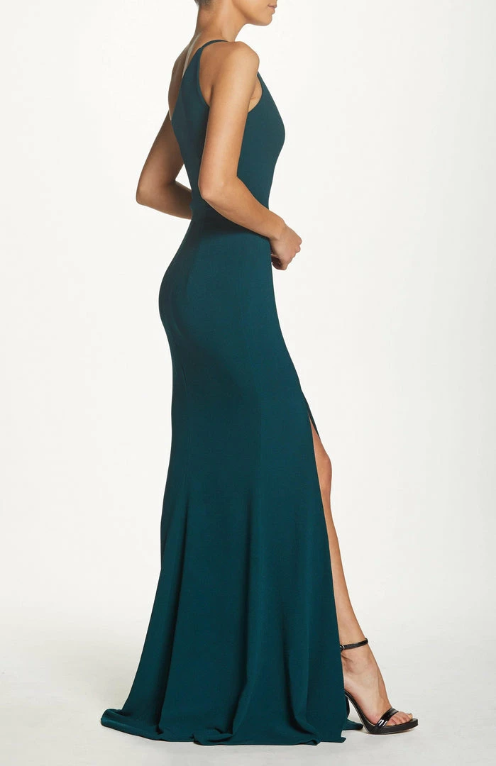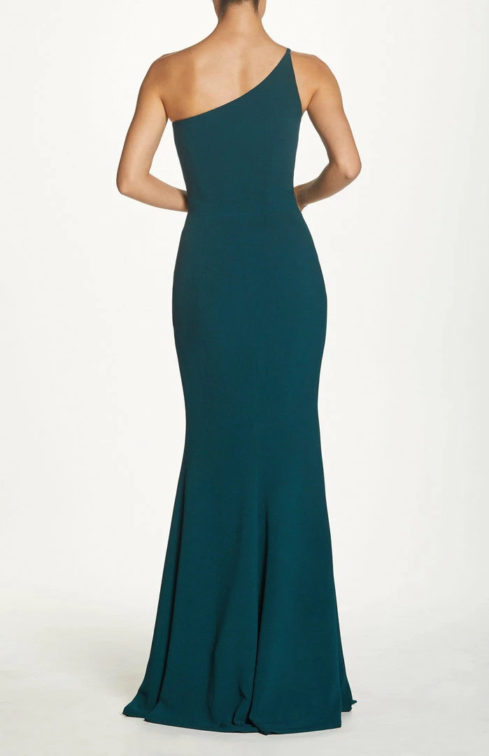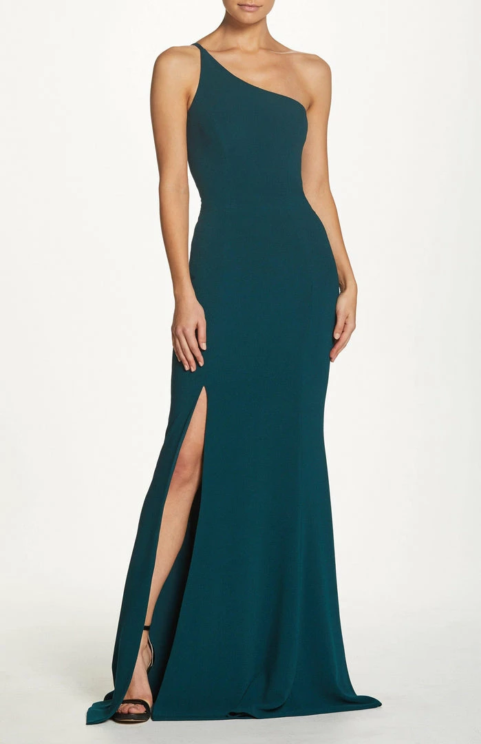 The Amy is a body-hugging floor-length gown made of classic Pine crepe. This elegant gown features an asymmetrical neckline that highlights the shoulders and decolletage. The long trumpet skirt and fitted bodice, which hugs the bust, waist, and hips, helps to create a gorgeous hourglass shape. This gown is flattering and versatile for any formal event.