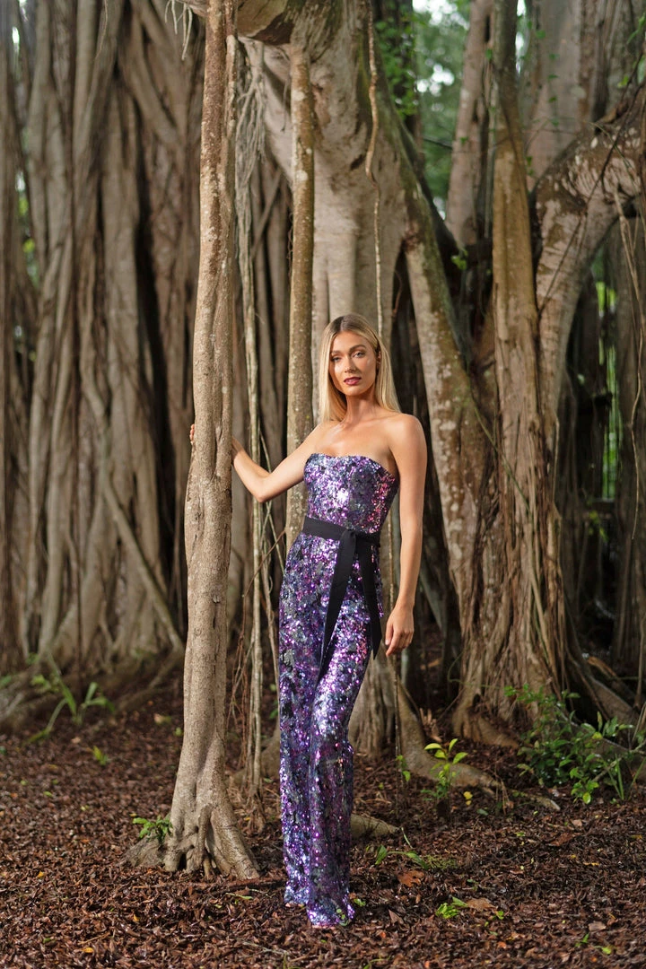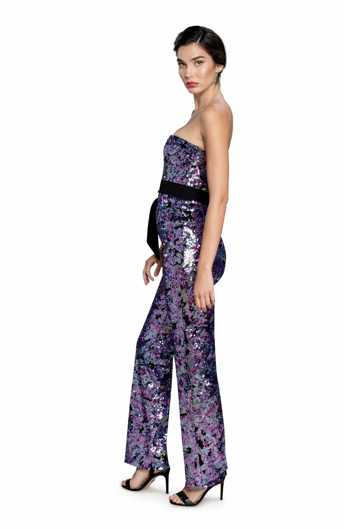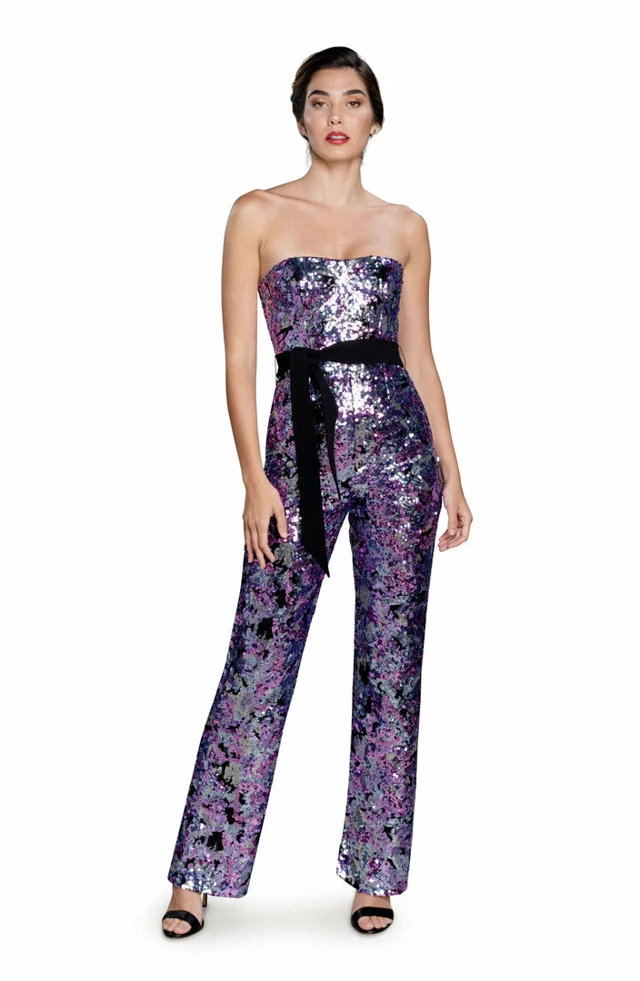 The Andy Jumpsuit in Amethyst Multi is set to make a statement. Featuring removable straps and belt for an alternate look on this fully interlocking yarn-lined Jumpsuit.