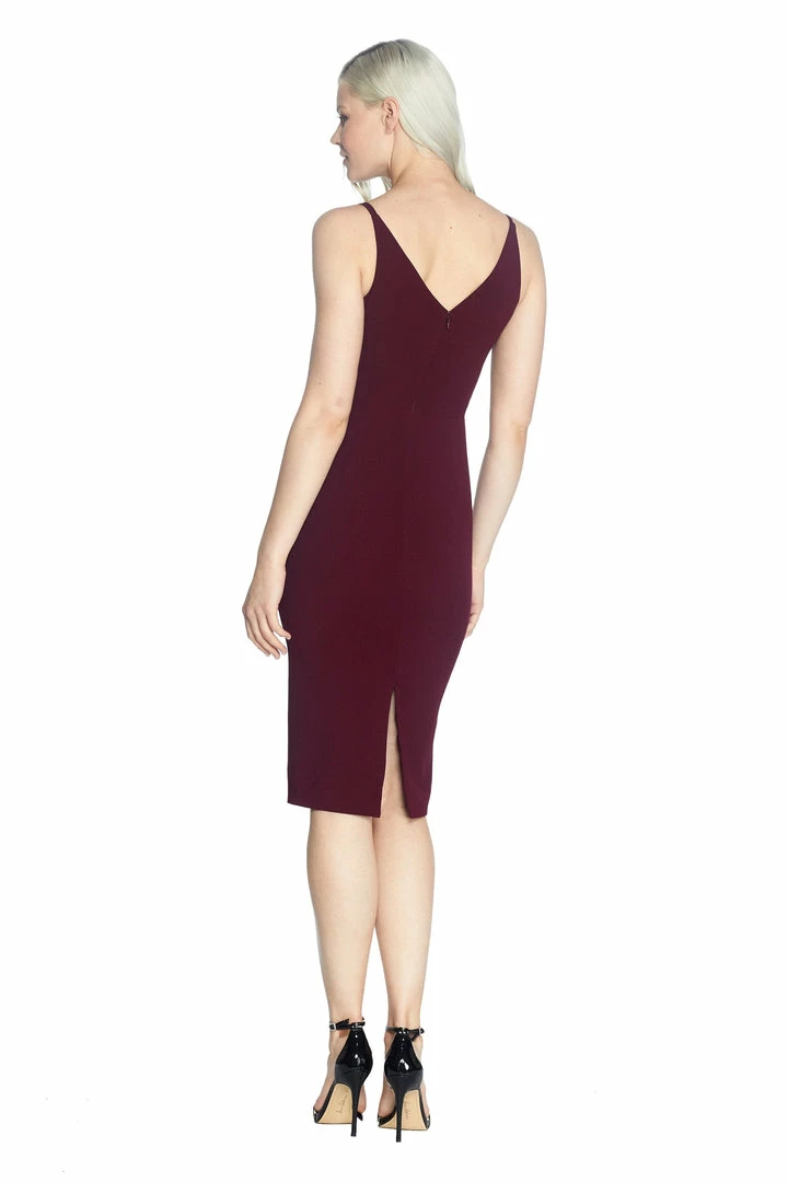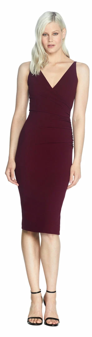 A perfect wardrobe staple, the Anita dress is a flattering style with a timeless silhouette. This sleeveless sheath design reveals just the right amount of skin with a deep v-neckline and low v-back. A faux wrap bodice with a ruched side has a slimming effect and elongates the body. The fitted knee-length pencil skirt makes this Burgundy crepe dress as versatile as it is irresistible.