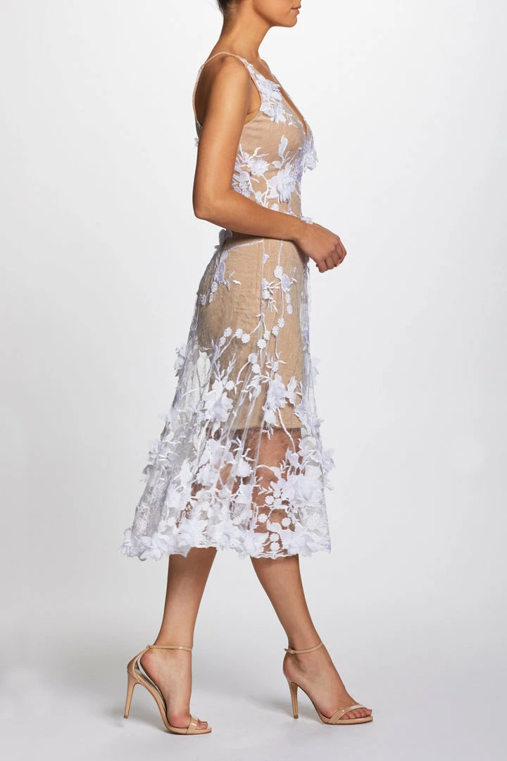A lush garden is created with beautiful floral embellishments on this one-of-a-kind dress. This spectacular dress has a nude sleeveless bodice and mini skirt underneath a Off White mesh-lace overlay. The sheer overlay is heavily adorned with floral embroidery and applique and has a flowy midi-length A-line skirt. Thin straps and a matching V-neck and back make the Audrey dress a perfect option for dressy springtime events.