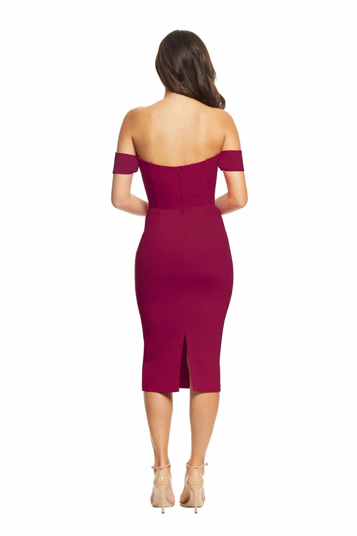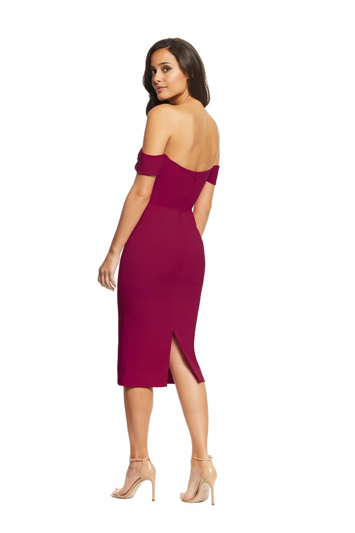 The form-fitting Bailey dress flaunts a cold-shoulder style sleeve and a semi-sweetheart neckline. The slit in the back of the snug pencil-shaped skirt adds a flirty touch to this sophisticated cocktail dress. This beautiful dress is made in our flattering classic crepe fabric in Dark Magenta.