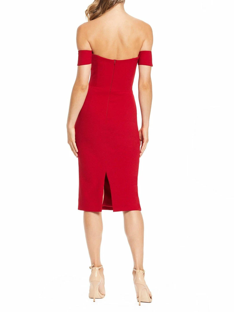 The form-fitting Bailey dress flaunts a cold-shoulder style sleeve and a semi-sweetheart neckline. The slit in the back of the snug pencil-shaped skirt adds a flirty touch to this sophisticated cocktail dress. This beautiful dress is made in our flattering classic crepe fabric in Garnet.