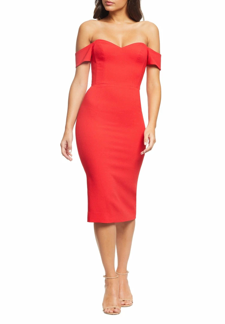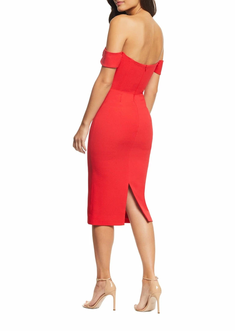 The form-fitting Bailey dress flaunts a cold-shoulder style sleeve and a semi-sweetheart neckline. The slit in the back of the snug pencil-shaped skirt adds a flirty touch to this sophisticated cocktail dress. This beautiful dress is made in our flattering classic crepe fabric in Rouge.
