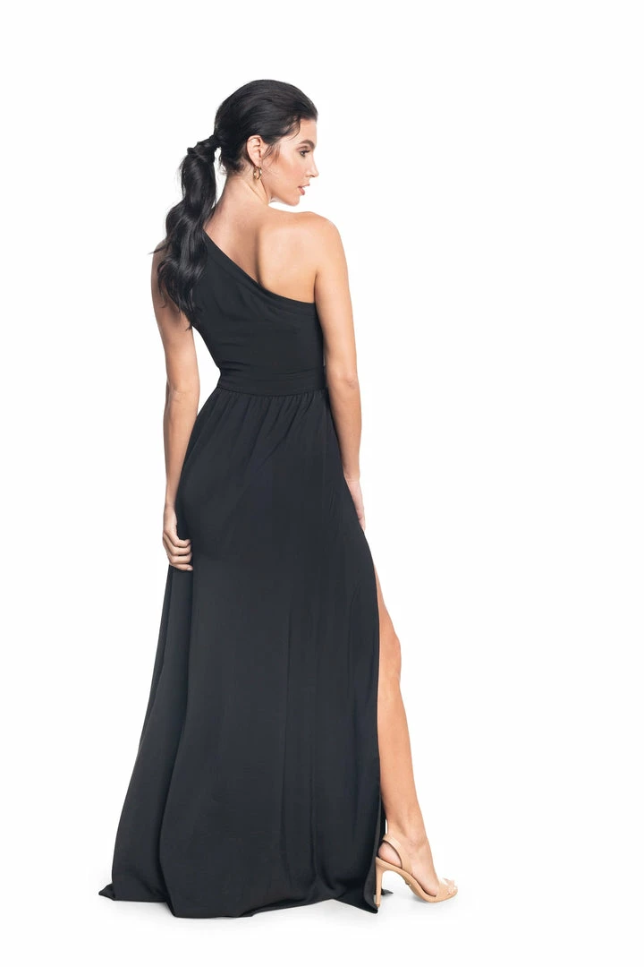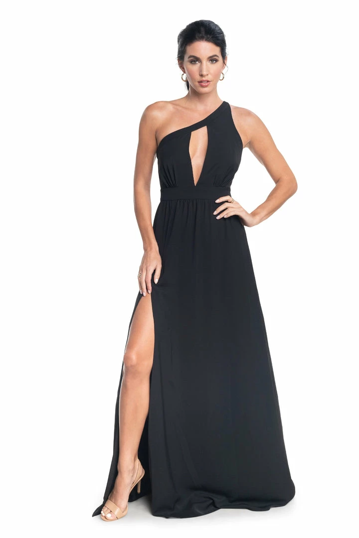 A gown suited for a Grecian goddess, the Bea is unique and beautiful with a full floor-length A-line skirt and asymmetrical top. A thigh-high side slit and a large keyhole center in the bodice show some skin. This gorgeous asymmetrical gown is made in our classic crepe in Black.