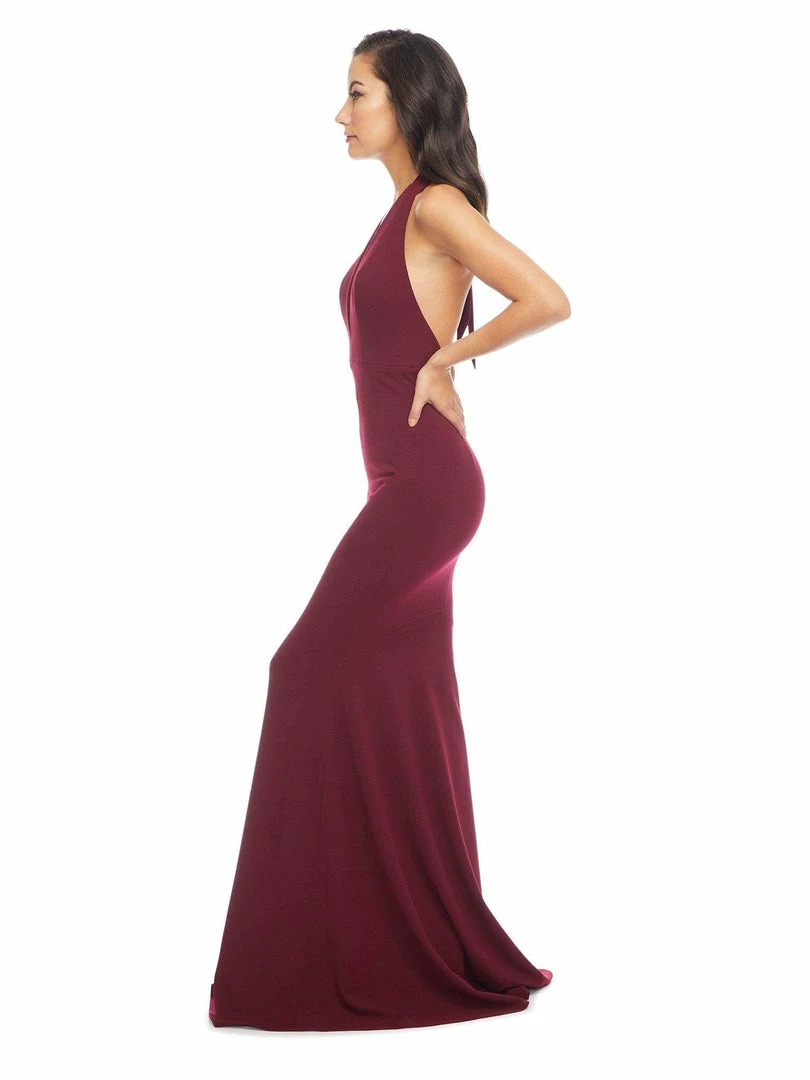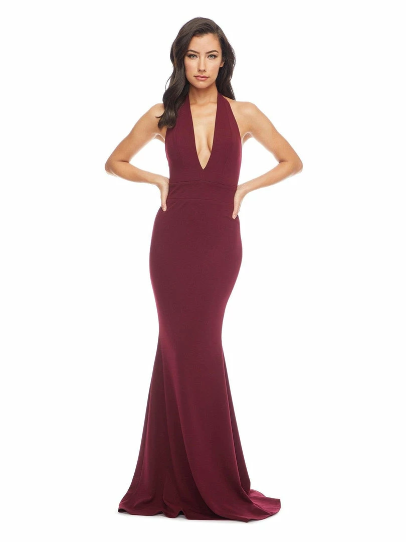 This figure-skimming mermaid gown in Burgundy is as glamorous as they come. Cut with a plunging neckline and an open back, the stunning Camden gown has a halter neck that ties in the back. A floor-length mermaid style skirt hugs the body through the hips and flares at the knees to recreate Old Hollywood style opulence.