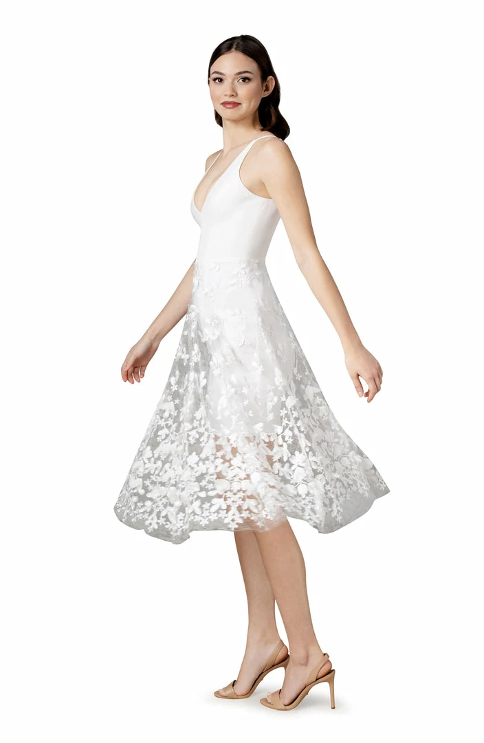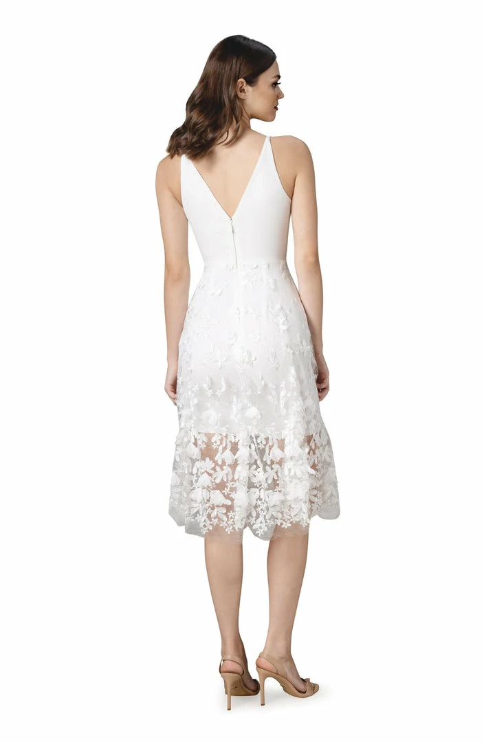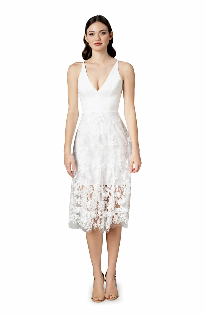 The feminine Darleen dress is form fitting underneath a beautiful sheer fabric skirt with a floral design in White. The slender straps and deep v-neckline makes this dress perfect for the spring and summertime. An elegant dress that proves beauty is in the details.