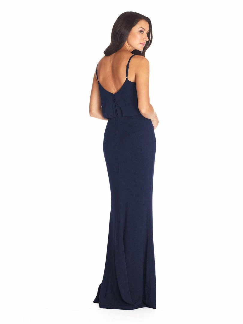 A touch of sophistication, and a touch of sexy our Gracelyn dress in Midnight Blue has it all. She features both graceful drape, a high waist silhouette, and finishes with an always alluring thigh-high slit in the gently flared floor sweeping skirt.