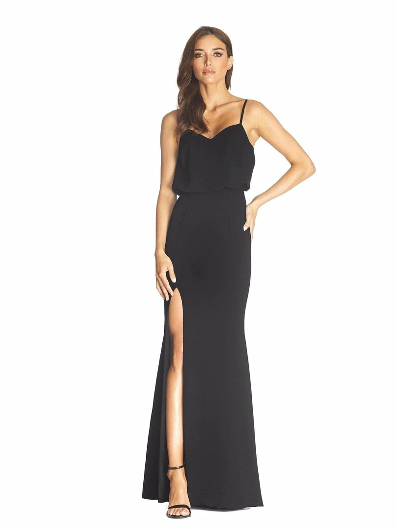 A touch of sophistication, and a touch of sexy our Gracelyn dress in Black has it all. She features both graceful drape, a high waist silhouette, and finishes with an always alluring thigh-high slit in the gently flared floor sweeping skirt.