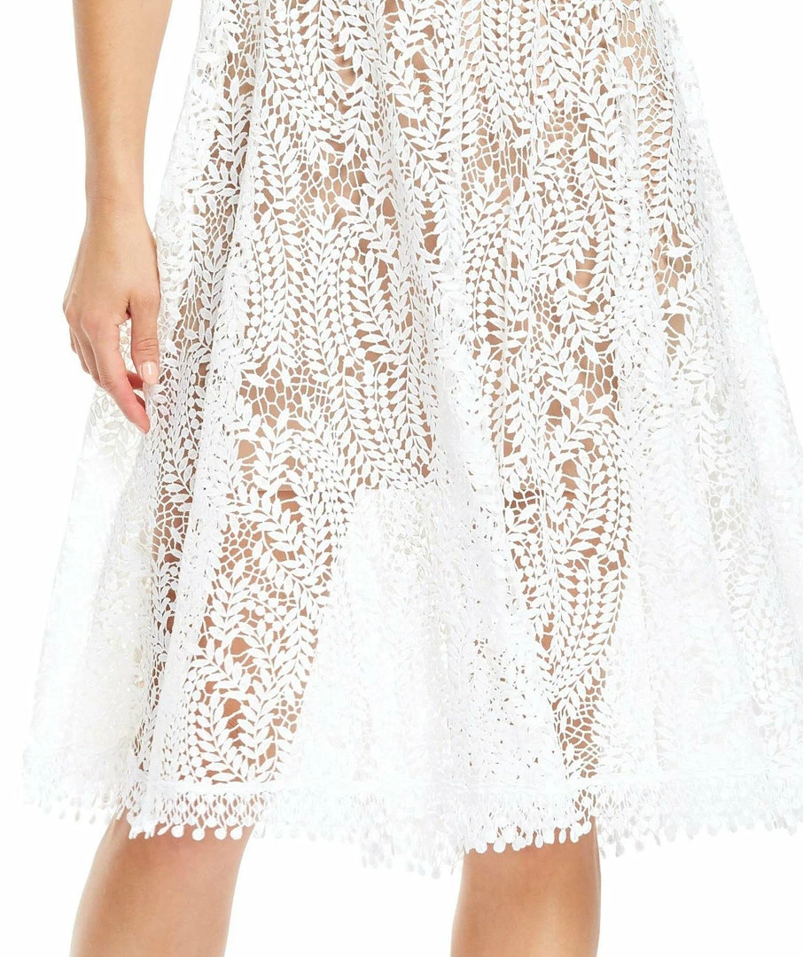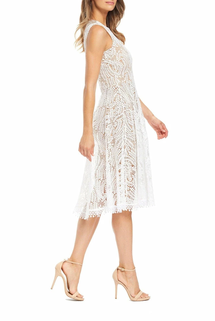 Sleeveless high neck A-Line dress with scrolling vine lace pattern over nude slip