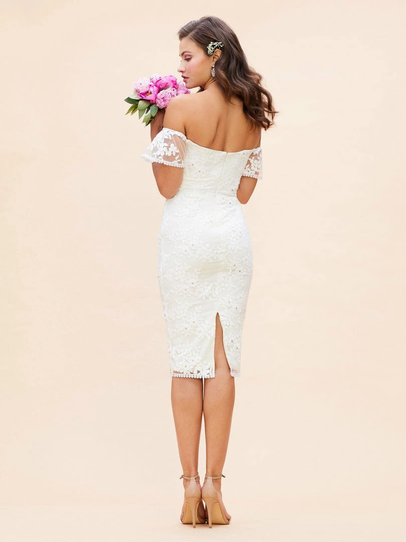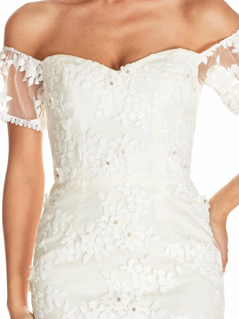 Featuring a sweetheart neckline, sheer off shoulder sleeves, and a curve flattering bodycon silhouette in White. The Tara Dress offers an ethereal romantic finish with a floral overlay, and an over the knee hemline.