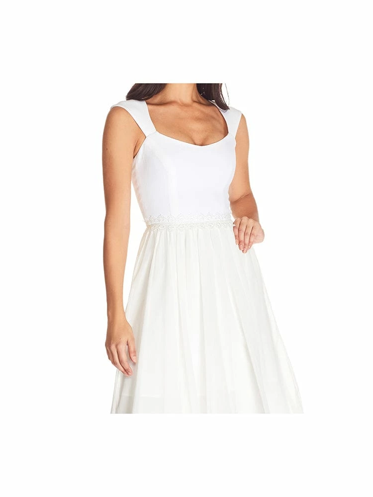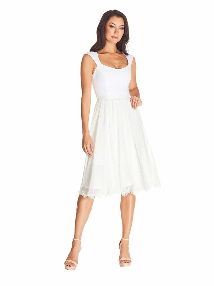 The Brielle Dress is a fit and flare dress with a chiffon skirt and a lace trim at the waistÂ