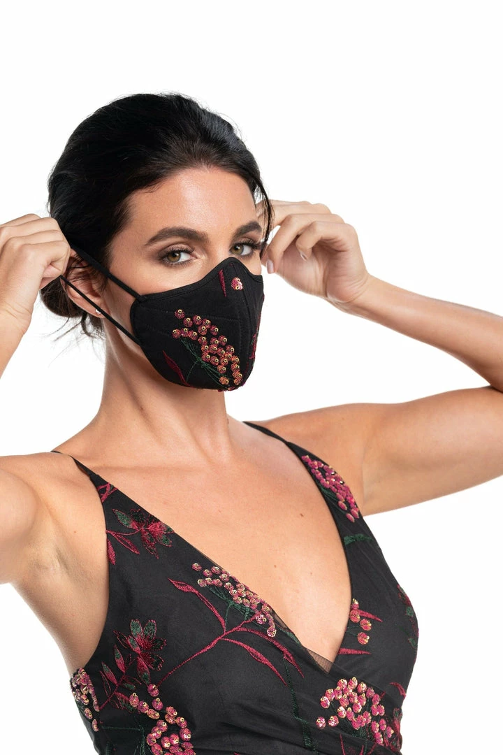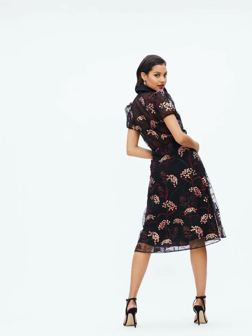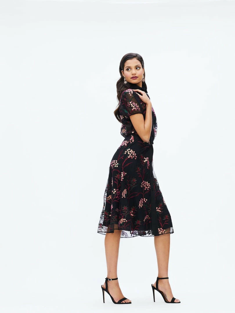The one-of-a-kind Camille dress pairs a sweet silhouette with a sexy, sheer overlay. The gorgeous black mesh-lace overlay is adorned with glittering pink and purple sequins and magenta floral embroidery. A collared button-down top adds polish to the youthful puff sleeves and knee-length A-line skirt.