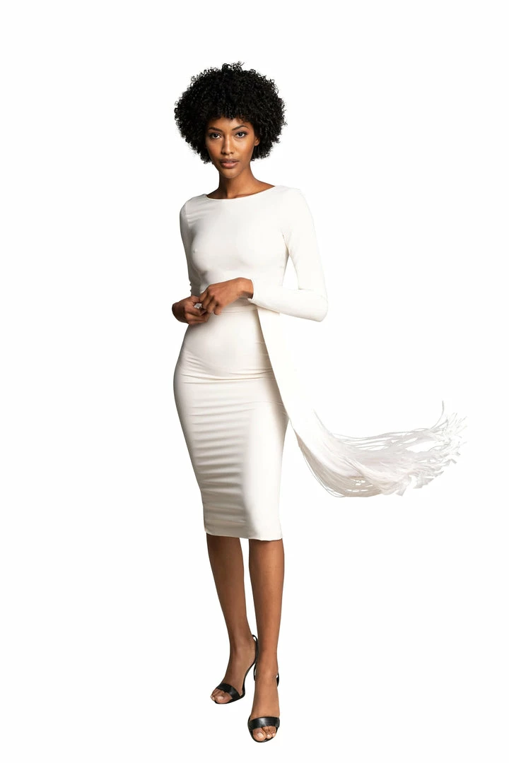 This slinky and stretchy cocktail dress adds extra drama with a snug pencil skirt and a long, trailing fringe sash around the waist. An elegant bateau neckline and long sleeves balance a low scoop back and back slit in the skirt, revealing just enough skin on this bold sequin style.