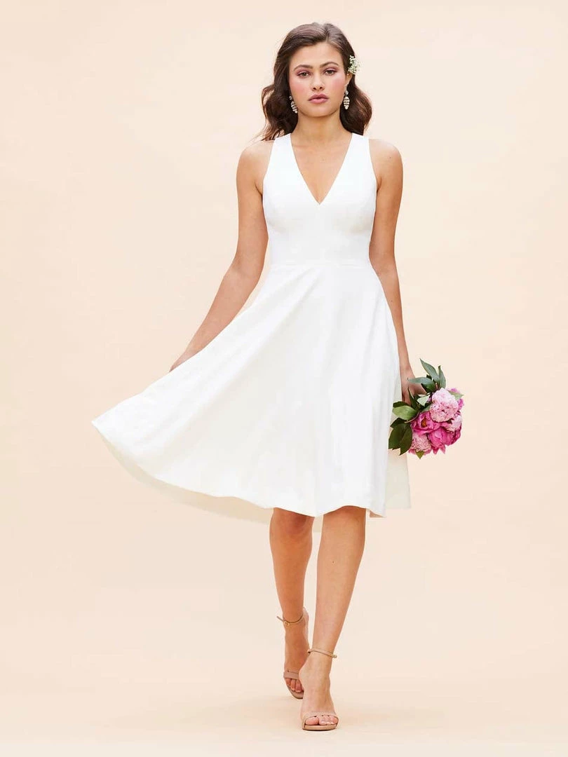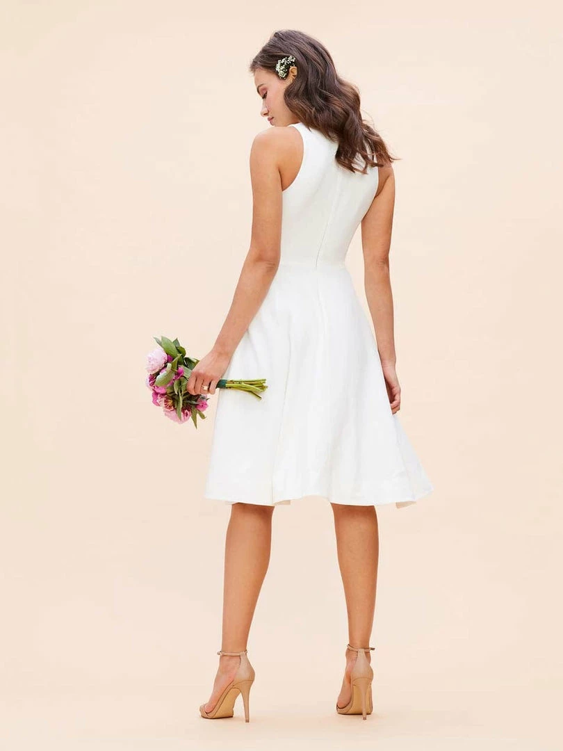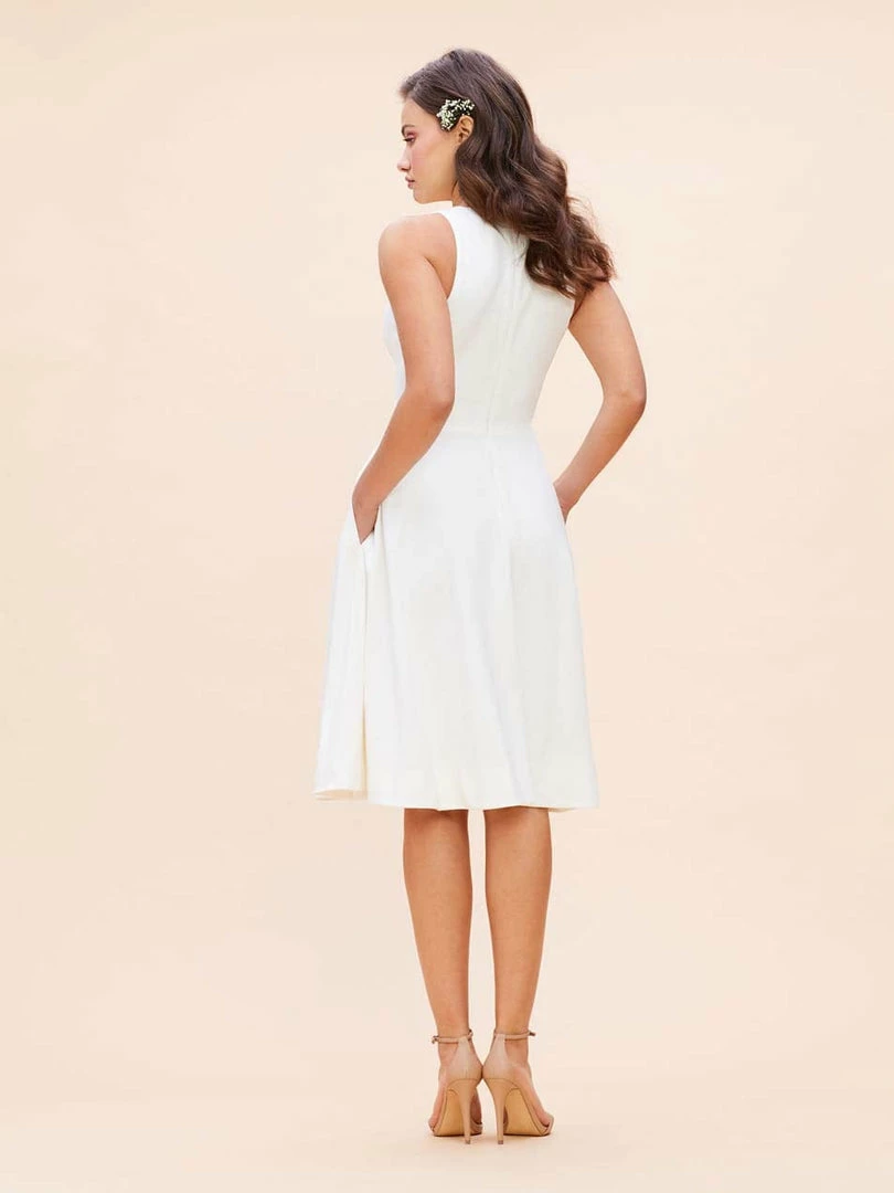 The Catalina is a crepe cocktail dress with a fit and flare silhouette and a v-neckline that flatters all body shapes. The bodice is fitted and tapers in to hug the waist, and the knee-length skirt is playful but polished. This off-white sleeveless dress has modest straps wide enough to cover the shoulders and two side pockets.