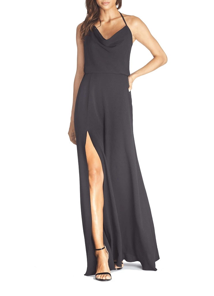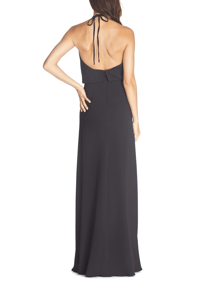 This gorgeous black crepe gown will become your new event-wear go-to. The Cheyenne gown features a draped halter neck with a flowy blouson bodice, creating an alluring open back. The floor-length sheath skirt elongates the body and has a thigh-high slit in the front.