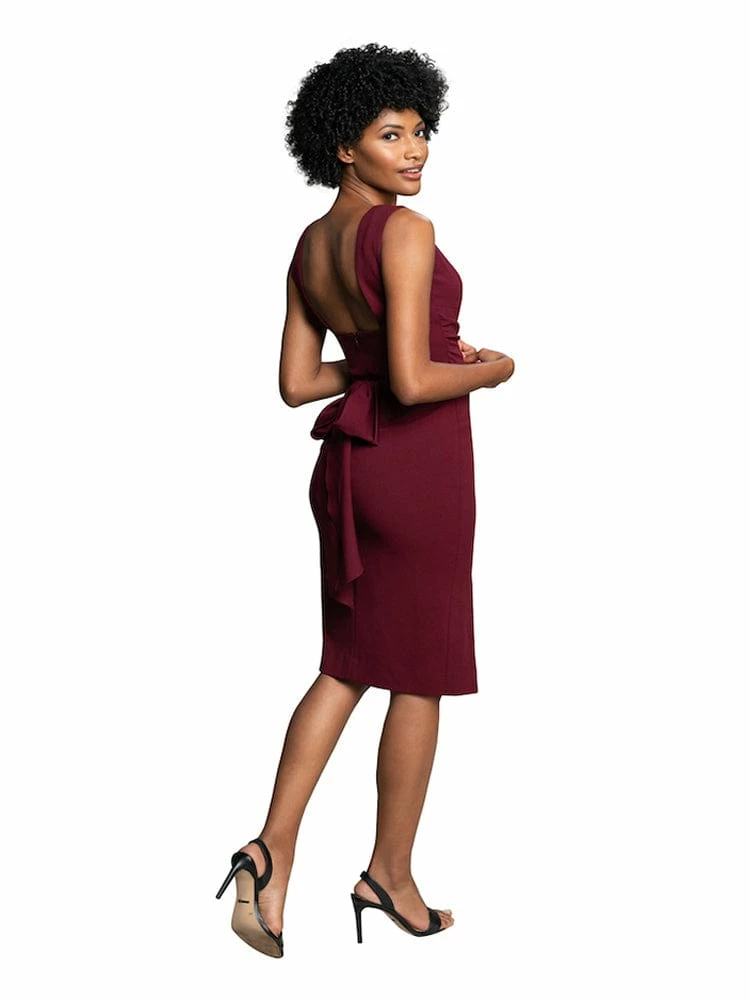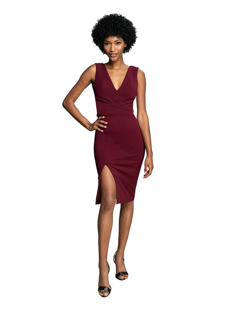Flattering and sophisticated, this midi-length crepe dress in Burgundy features a figure-skimming silhouette, alluring side slits, and a tie that wraps around the waist.