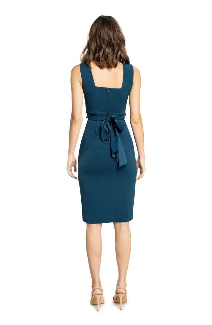 Flattering and sophisticated, this midi-length crepe dress in Peacock Blue features a figure-skimming silhouette, alluring side slits, and a tie that wraps around the waist.