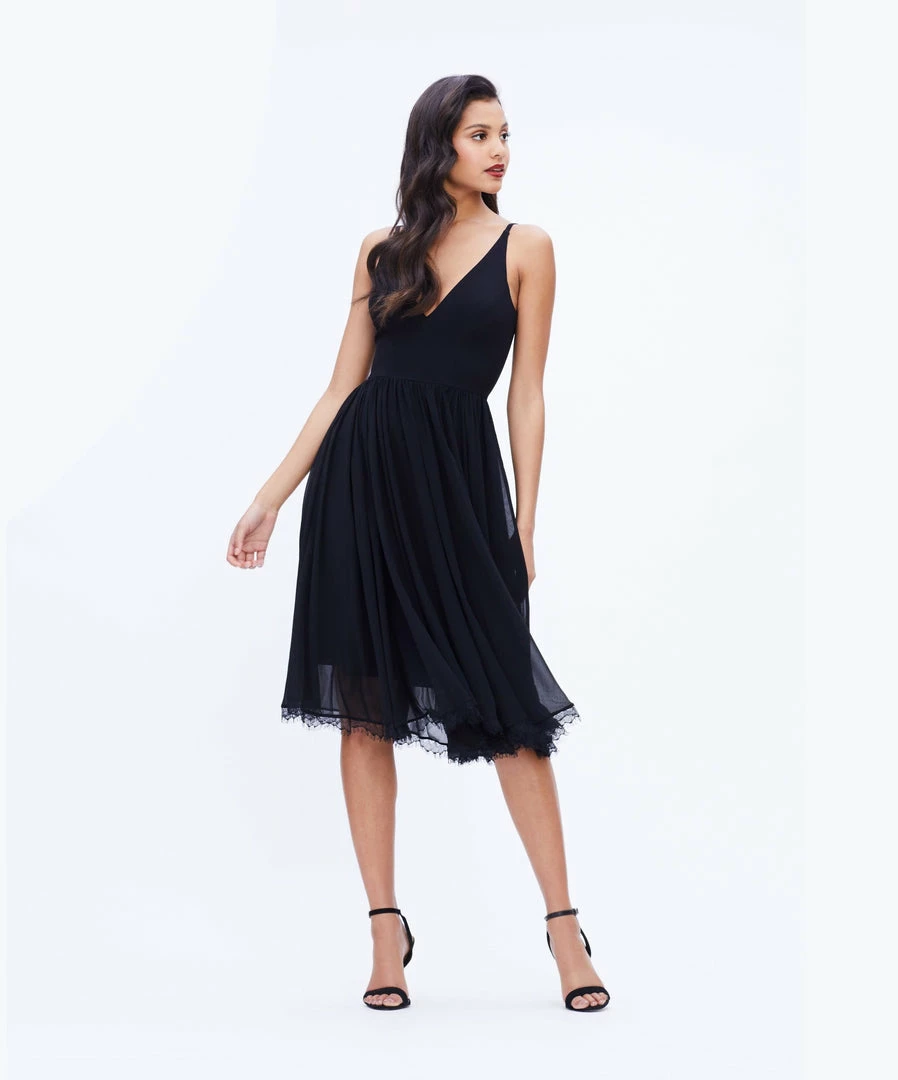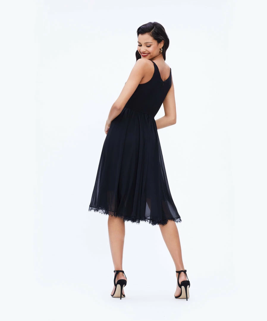 Offering textural contrast in a monochromatic palette, this versatile party dress in Black pairs a fitted crepe bodice with a softly gathered chiffon skirt. Slender straps and a plunging neckline highlight luminous skin, while a scalloped lace hem makes a romantic finish.