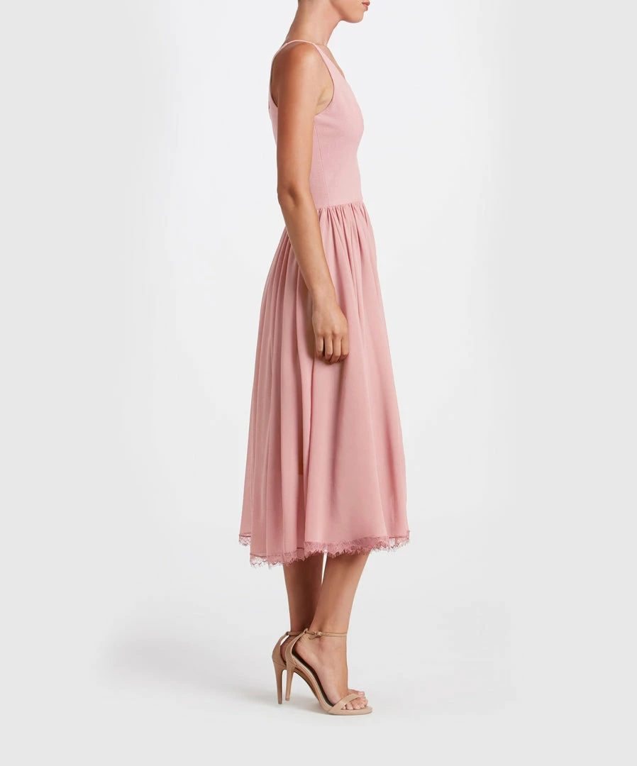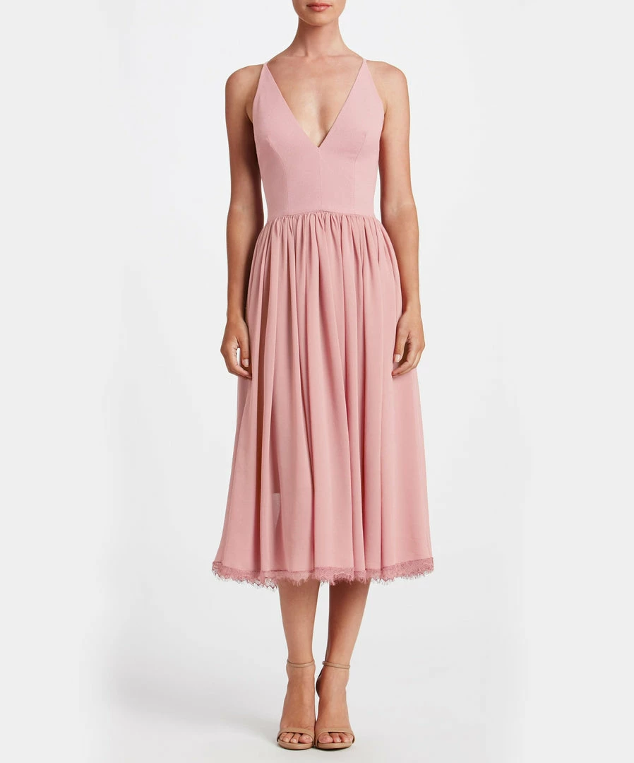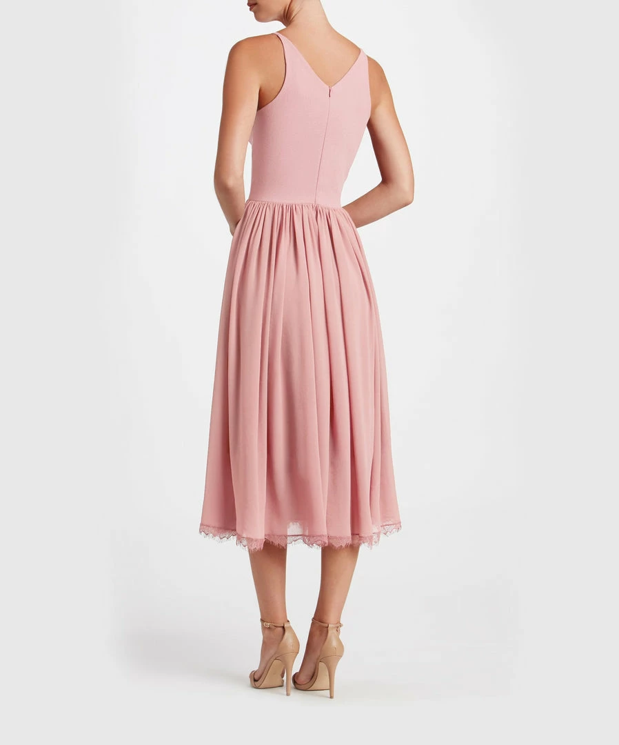 Offering textural contrast in a monochromatic palette, this versatile party dress pairs a fitted crepe bodice with a softly gathered chiffon skirt. Slender straps and a plunging neckline highlight luminous skin, while a scalloped lace hem makes a romantic finish.