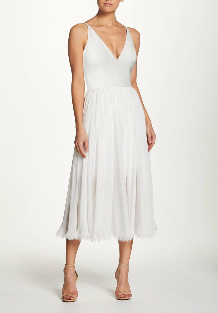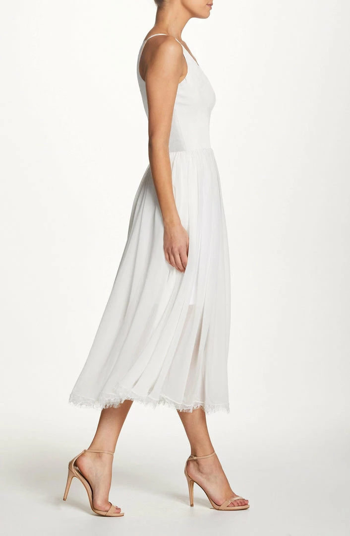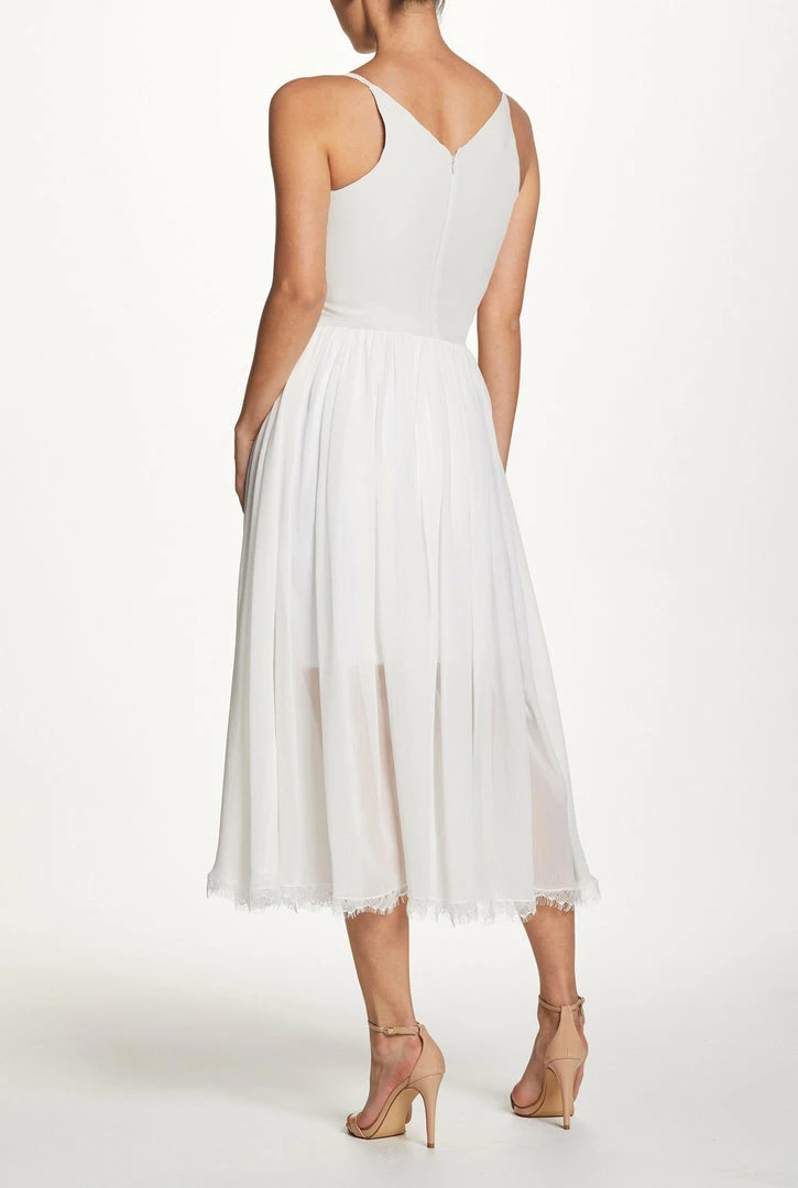 Offering textural contrast in a monochromatic palette, this versatile party dress in off white pairs a fitted crepe bodice with a softly gathered chiffon skirt. Slender straps and a plunging neckline highlight luminous skin, while a scalloped lace hem makes a romantic finish.