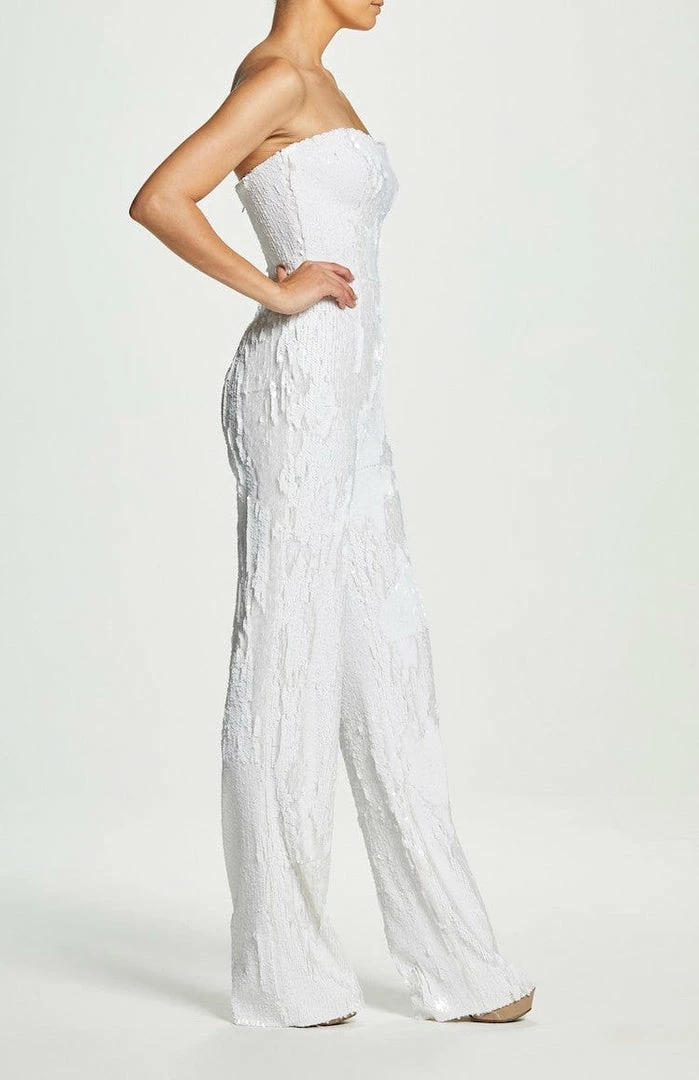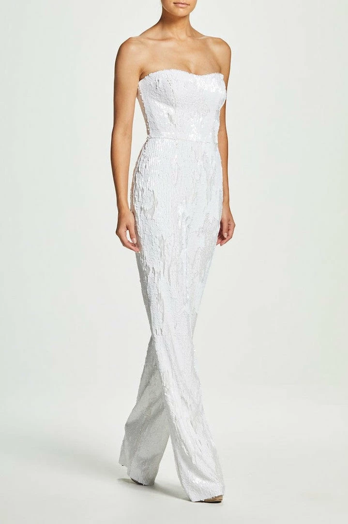 The Andy Jumpsuit in Lily dazzles with two-tone sequins from top to bottom. This glittery ensemble features a strapless semi-sweetheart neckline that shows off the shoulders and decolletage. Floor-length wide-leg pants create a straight silhouette to elongate the body. The white sequins create abstract patterns when pushed and manipulated in different directions with one side shiny and one side matte.