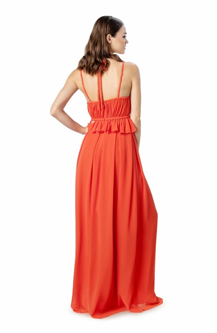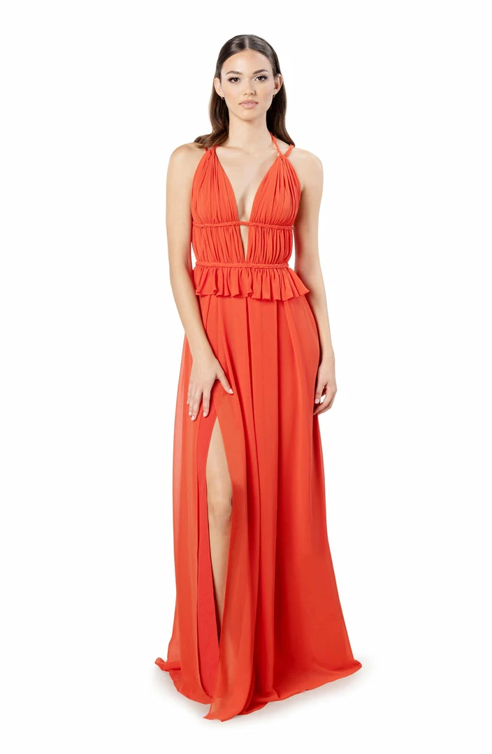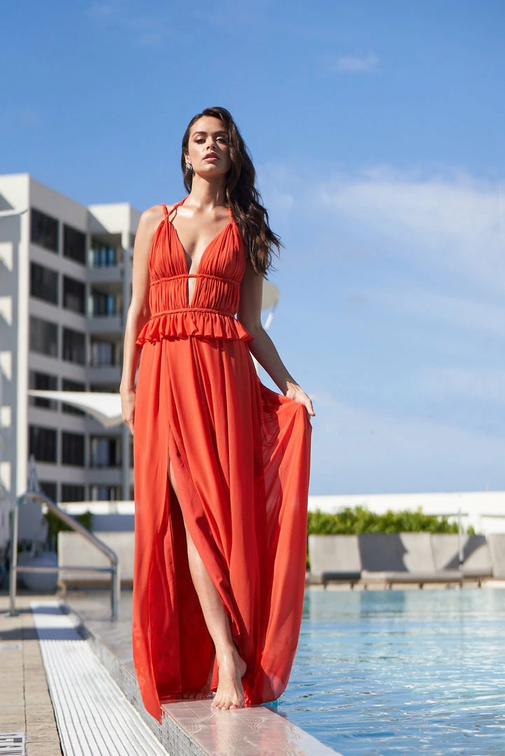 The thigh slip allows for more movement in the dress and emphasizes the light weight of the material.