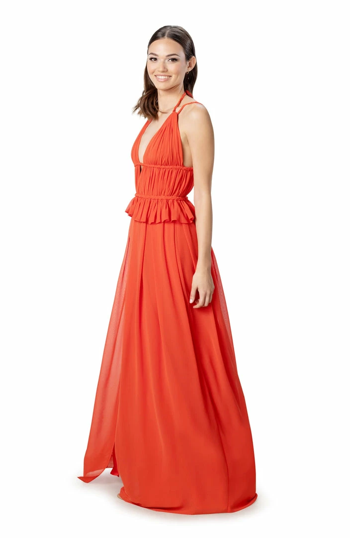The halter on this dress creates a unique shape on the bodice that meshes well with the peplum waistline, creating an open back.