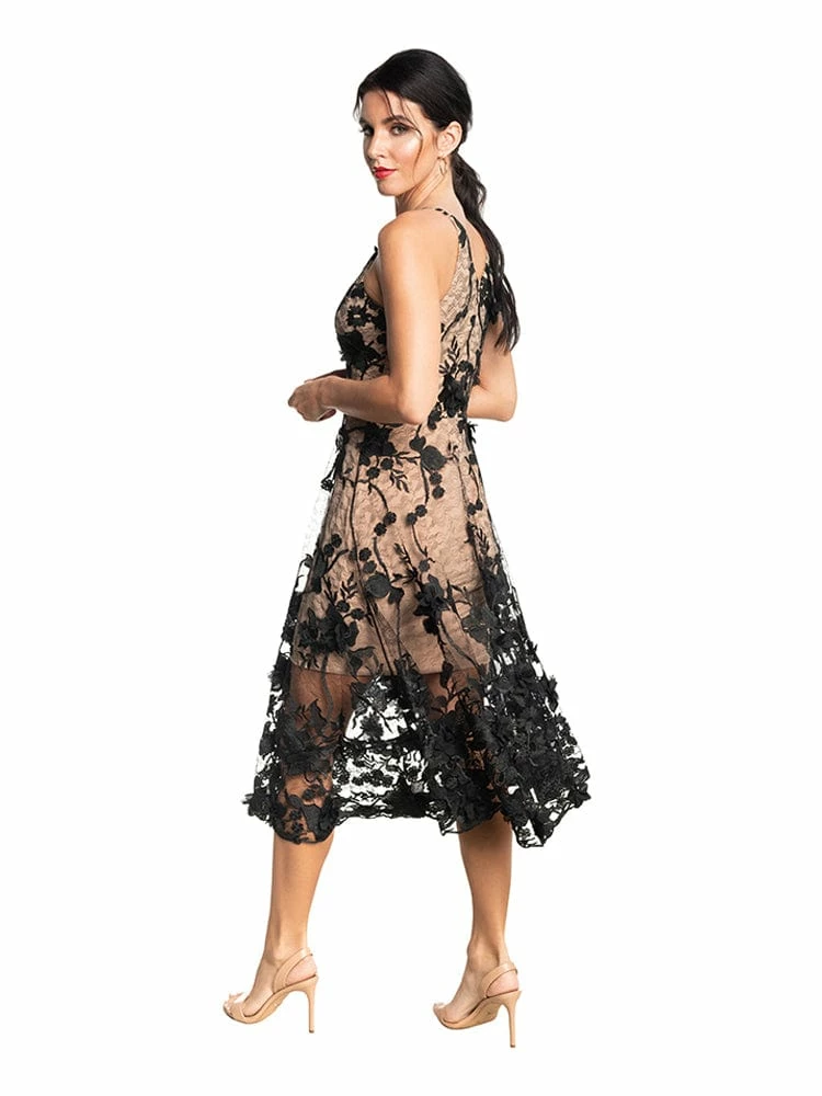 A lush garden is created with beautiful floral embellishments on this one-of-a-kind dress. This spectacular dress has a nude sleeveless bodice and mini skirt underneath a Black mesh-lace overlay. The sheer overlay is heavily adorned with floral embroidery and applique and has a flowy midi-length A-line skirt. Thin straps and a matching V-neck and back make the Audrey dress a perfect option for dressy springtime events.