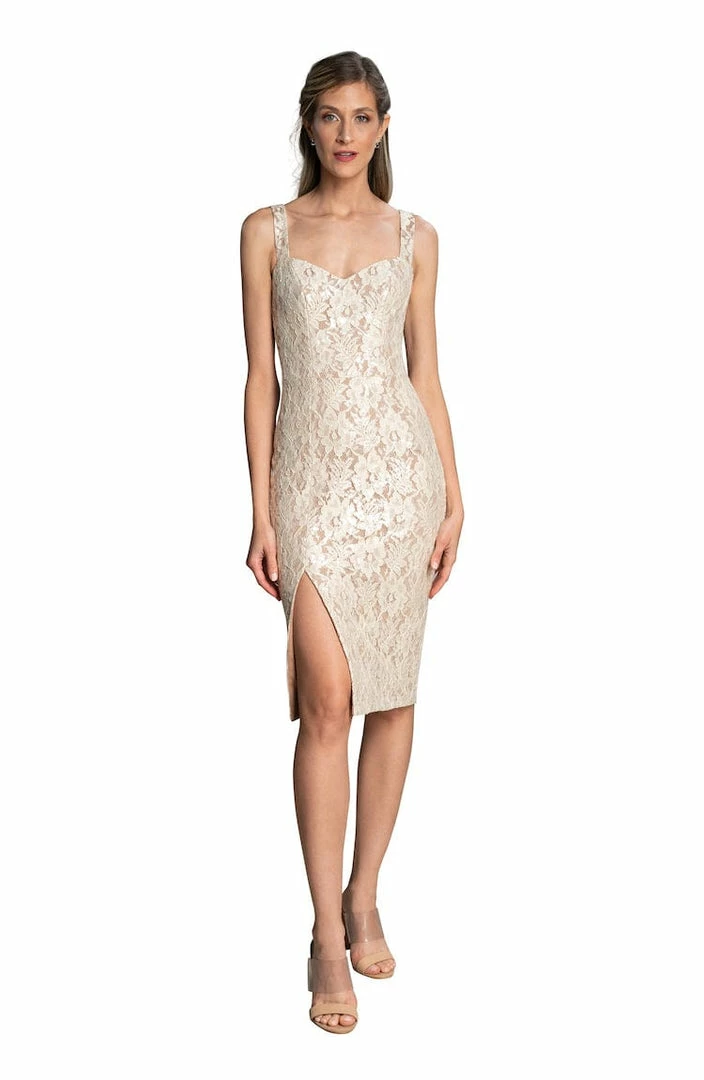 Gorgeous embroidered flowers embellish ivory lace on this ornate sleeveless pencil dress. Adding to the allure of this posh off-white dress is the semi-sweetheart neckline and a square back. The curve-hugging cocktail-length pencil skirt includes a decorative hem and a thigh-high slit in the front.