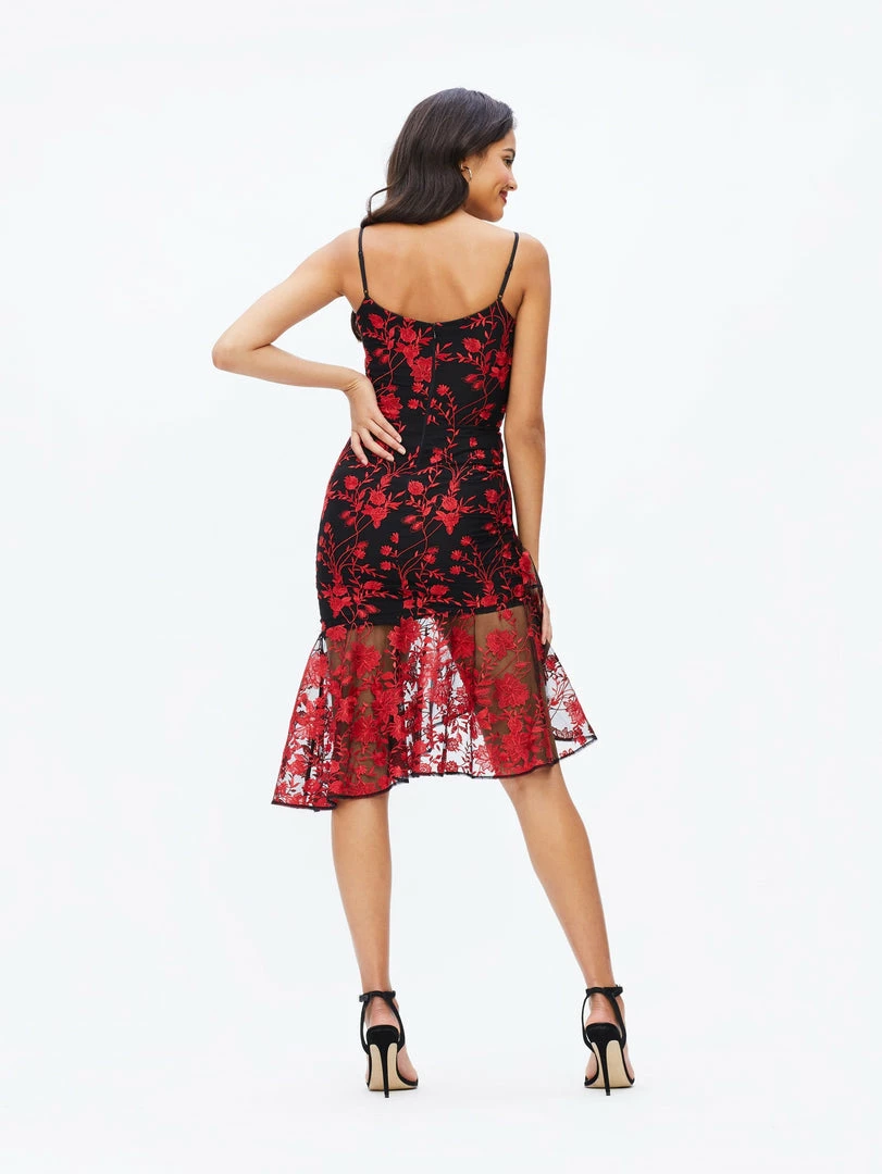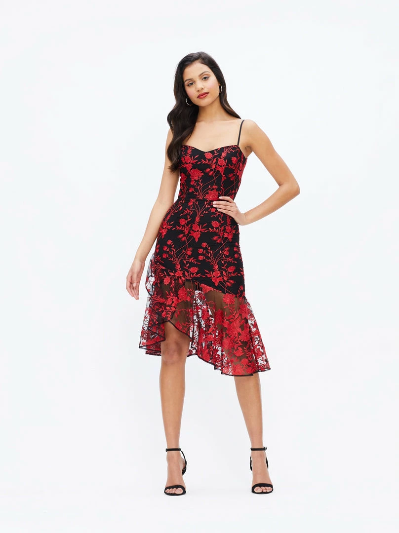 Fun, Flirty, and ready to Dance the night away. The Cantrelle hugs every curve and has a fun flirty ruffle hem to balance out the dress. The red floral embroidery adds a fun element to this perfect summer cocktail dress