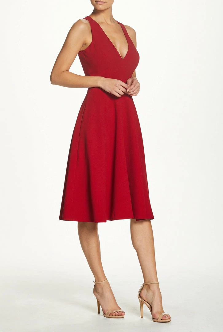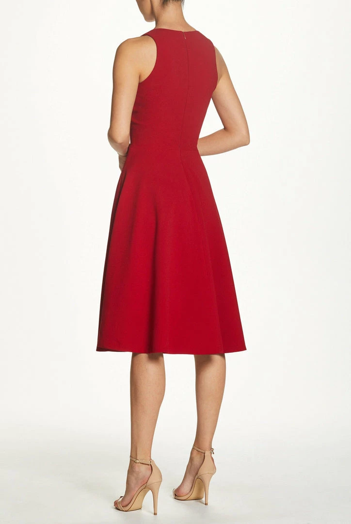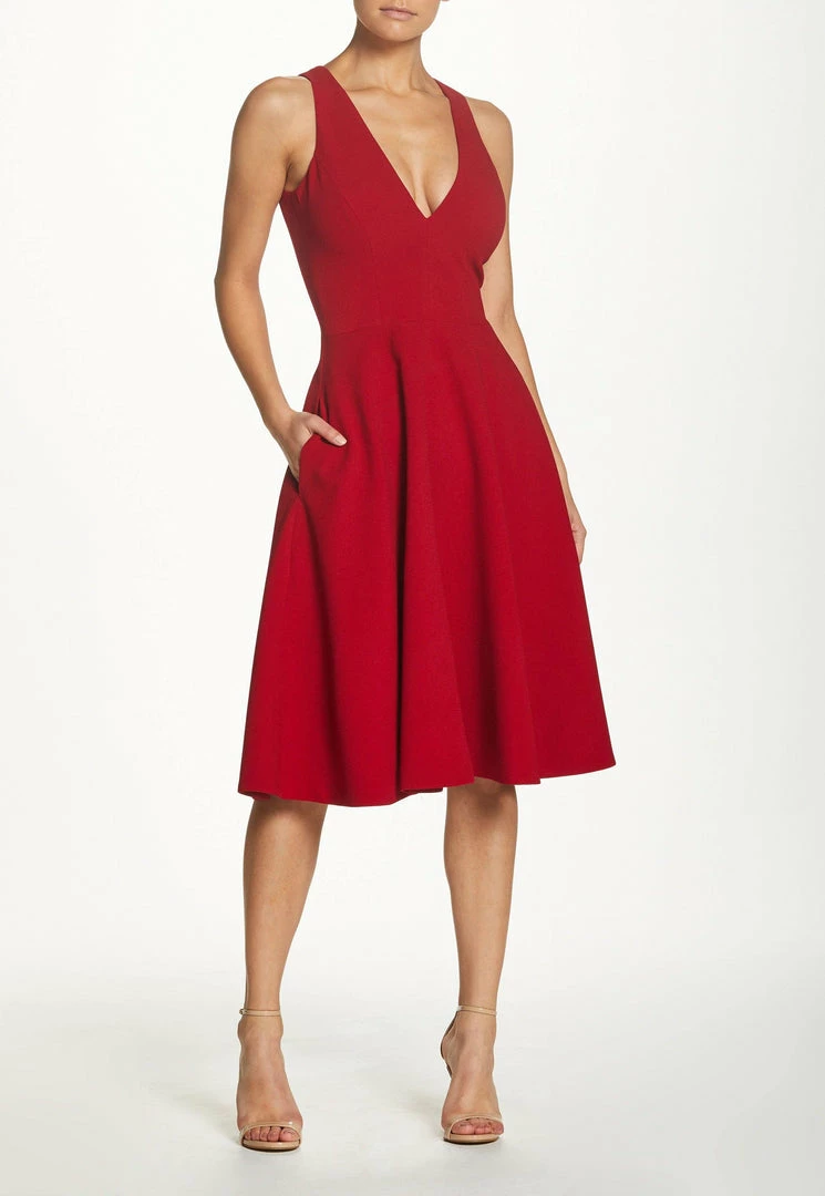 The Catalina is a crepe cocktail dress with a fit and flare silhouette and a v-neckline that flatters all body shapes. The bodice is fitted and tapers in to hug the waist, and the knee-length skirt is playful but polished. This Garnet sleeveless dress has modest straps wide enough to cover the shoulders and two side pockets.