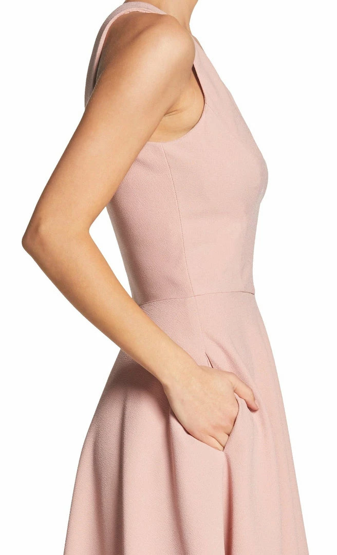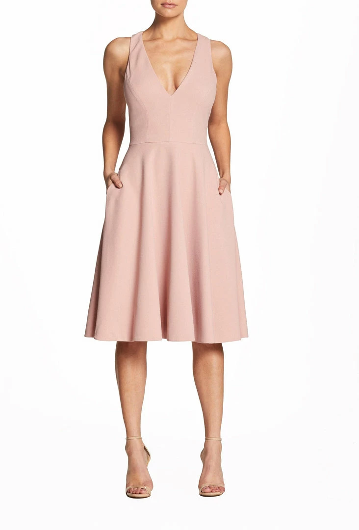 The Catalina is a crepe cocktail dress with a fit and flare silhouette and a v-neckline that flatters all body shapes. The bodice is fitted and tapers in to hug the waist, and the knee-length skirt is playful but polished. This Blush sleeveless dress has modest straps wide enough to cover the shoulders and two side pockets.