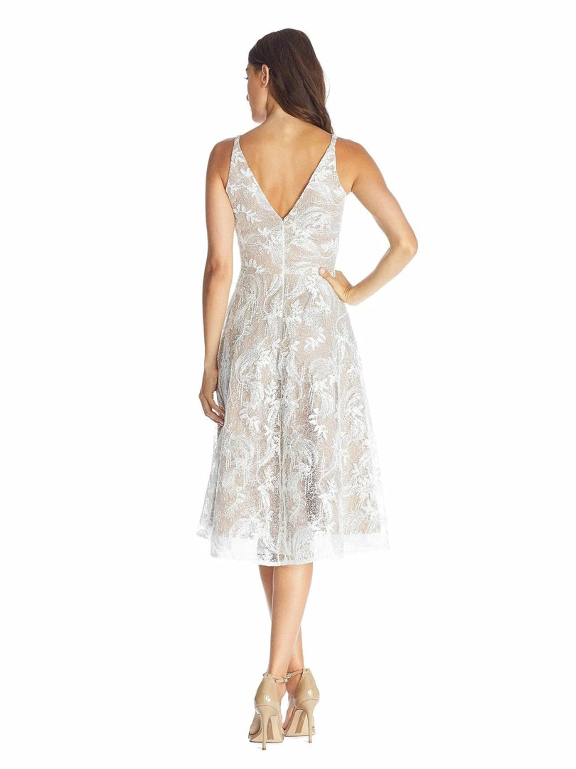 The gorgeous Elisa dress is embellished from head to toe. The fit and flare silhouette is complemented by a white lace cocktail-length skirt that flatters every body type. The sleeveless, form-fitting bodice has a plunging neckline perfect for dressy events and wedding season.