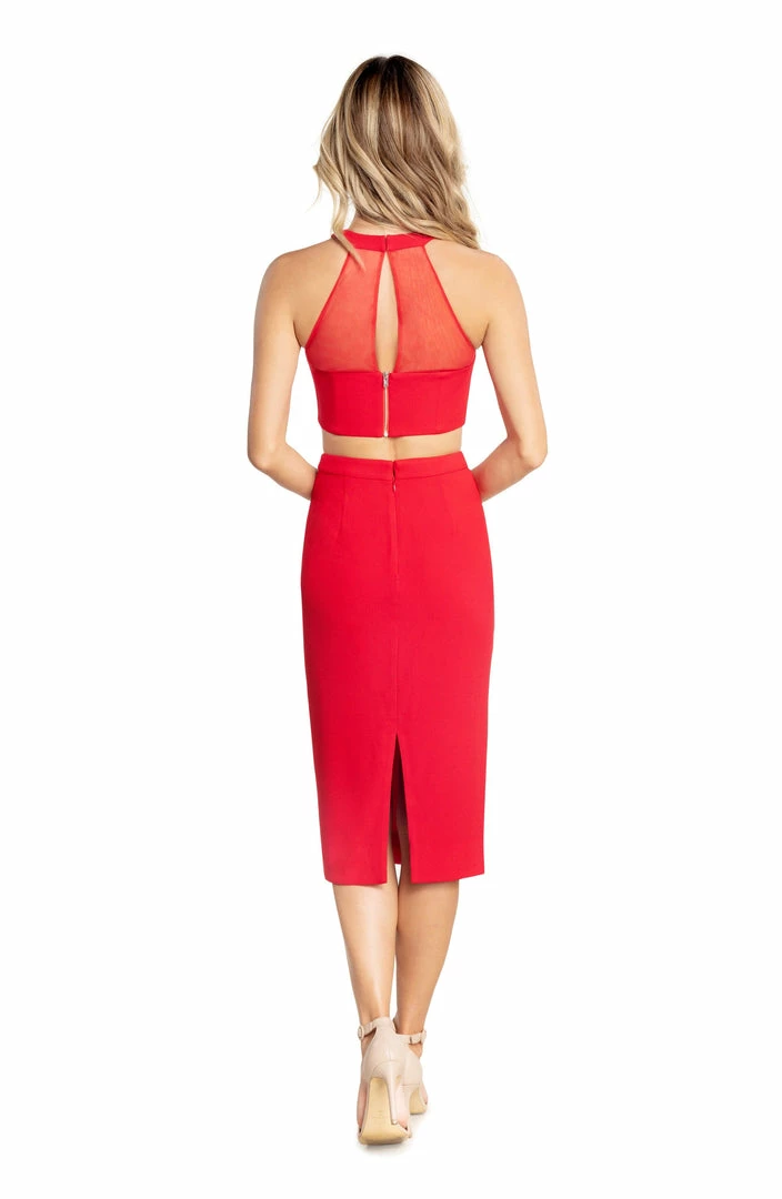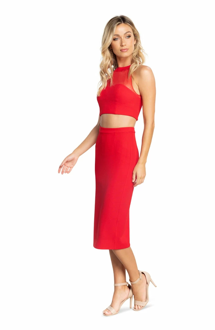 Two Piece set, this faux halter mixed media top pairs perfectly with our classic crepe pencil skirt. Pair together or separately.