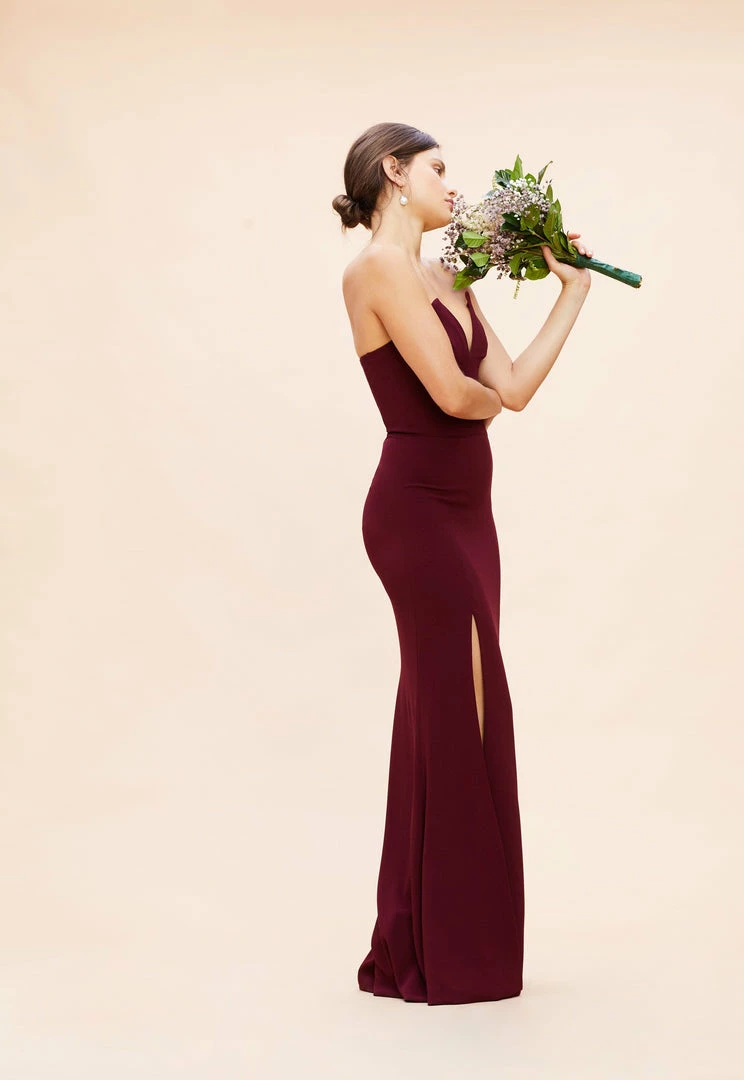An architectural neckline lets you show off your shoulders in this elegant evening gown in Burgundy with a thigh-high slit at the front.