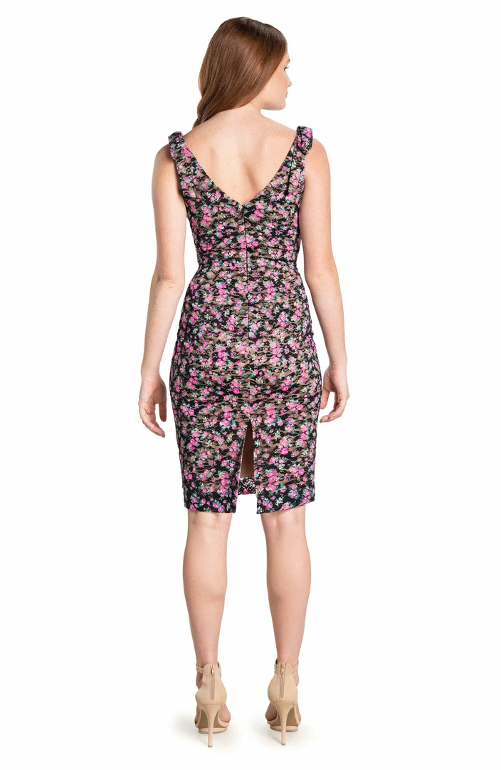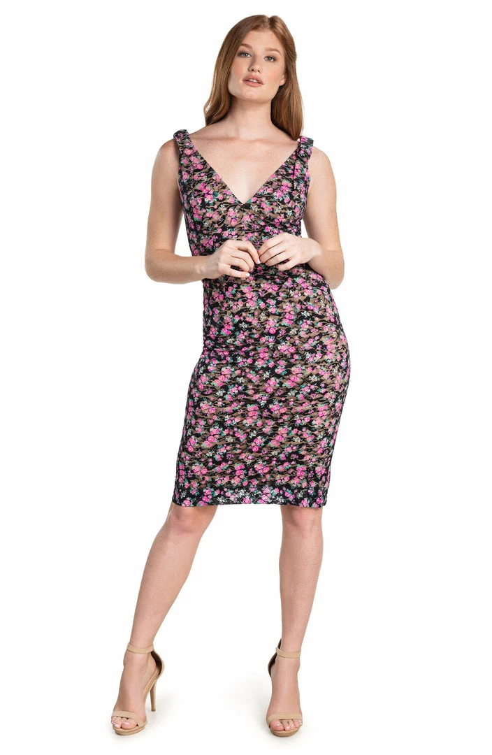 Feel stunning from every angle when you celebrate life in the Mary Dress in Black Multi. Featuring a plunging v-neckline, bow tie shoulders, and an hourglass bodycon silhouette, finishing off with a modest mid-length hemline.