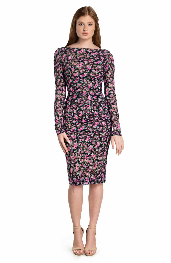Long-sleeved ruched floral print stretch lace bodycon midi dress.