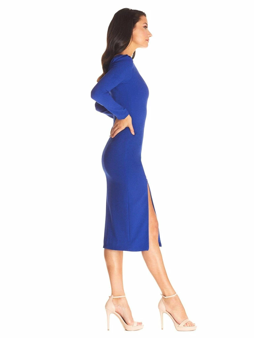 Display elegance and confidence with the Nadia dress in Cobalt. Featuring a high round neckline, long sleeves that puff at the shoulder, and a form fitting silhouette. With a front slit, and back slit detail that zip and unzip to your preferred length. Perfectly styled for modest to modern occasions.