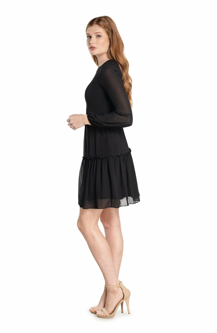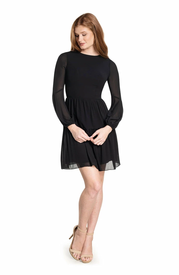 Blouson sleeve high neck open back mini dress with chiffon non stretch fabric
