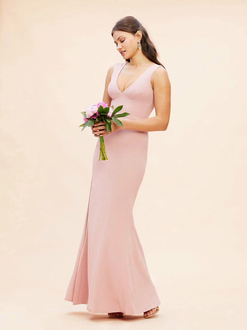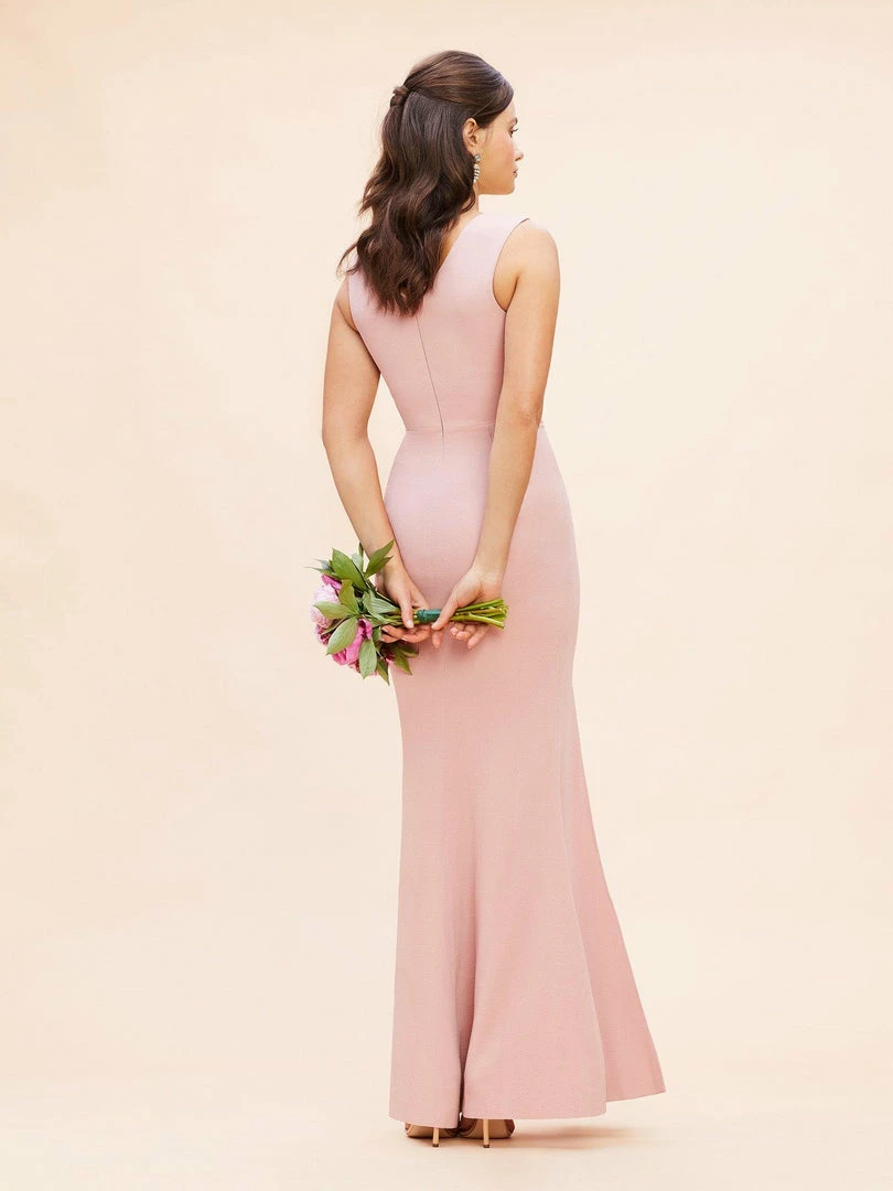 This striking floor-length style is made in our classic stretch-crepe in Blush. This sleeveless mermaid gown fits snuggly through the torso and hips and has a subtly flared skirt. It features a plunging v-neckline, curved v-back, and a thigh-high side slit.