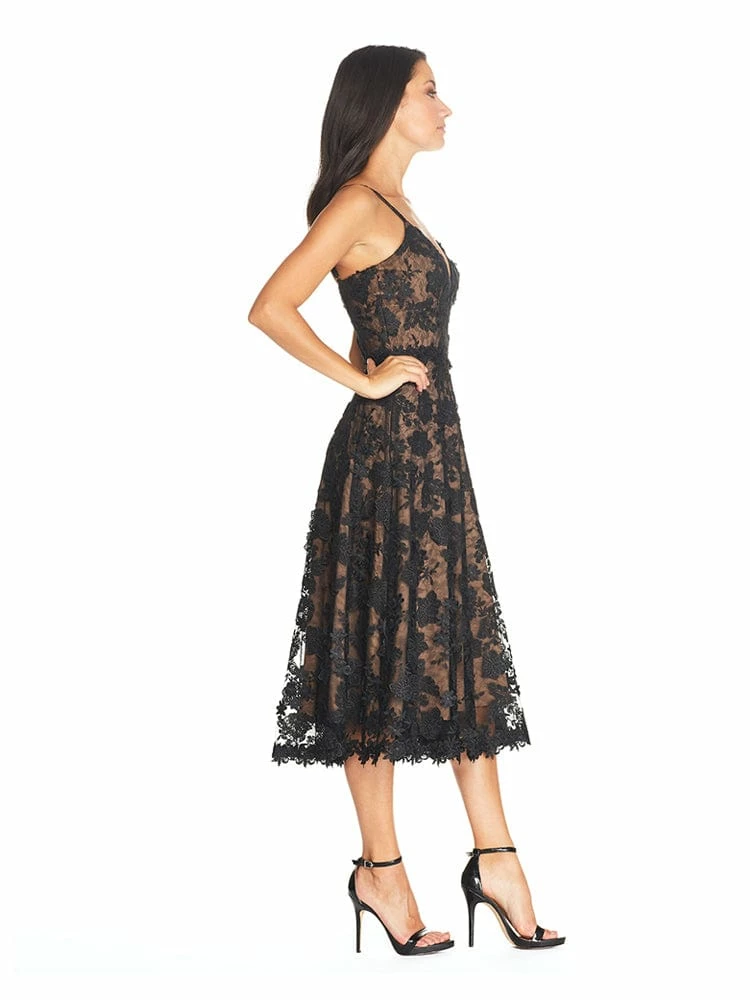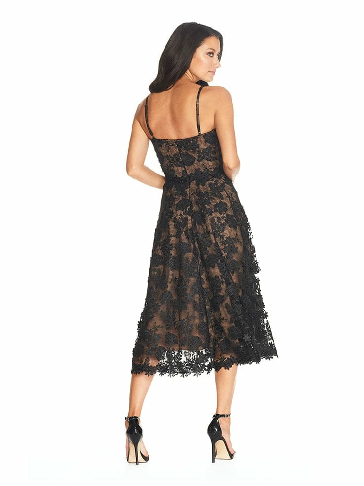 The Tahani Dress has an all over floral embroidery design on non stretch tulle, featuring a sweetheart neckline and adjustable straps. The hemline is finished with a floral trim, giving an extra feminine touch. This fit and flare style dress is perfect for a warm summer night or even a special occasion.