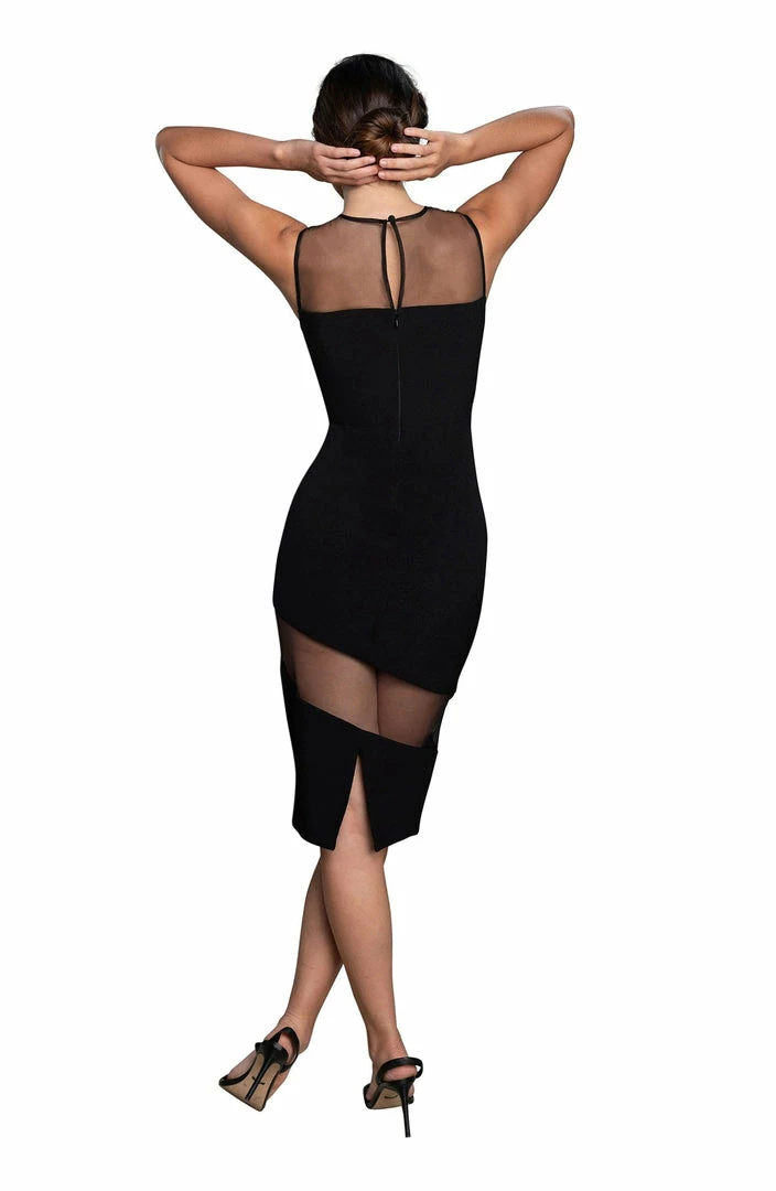 Mixed media high neck bodycon midi dress with carefully placed sheer inserts.