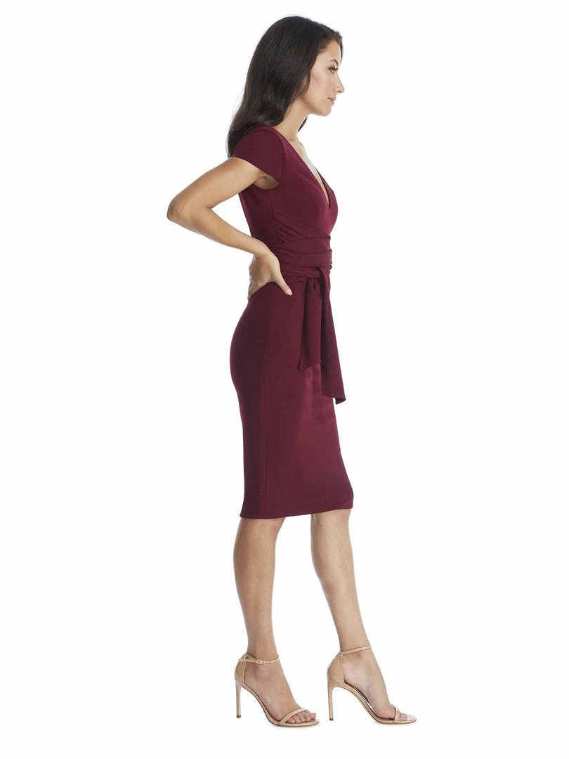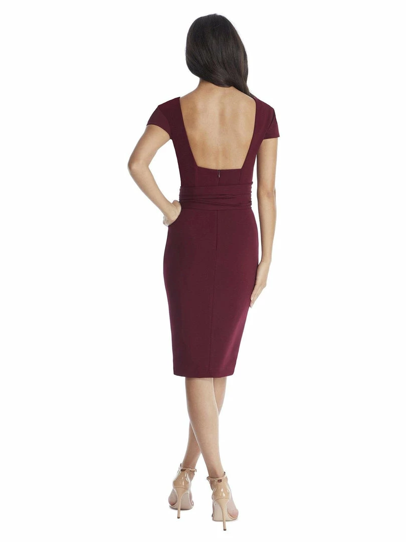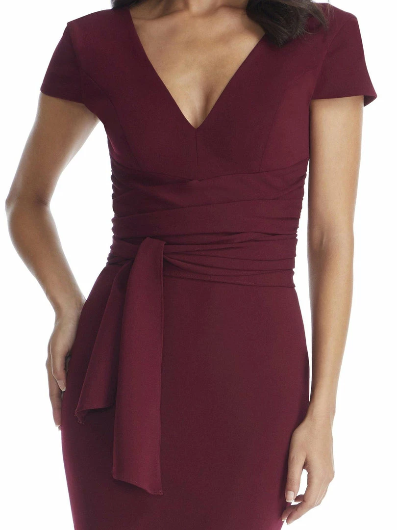 A cut-to-flatter body-con sheath in Burgundy is styled with a deep V-neck, an even deeper square back and a crisscrossing sash at the waist to slim as it shapes.