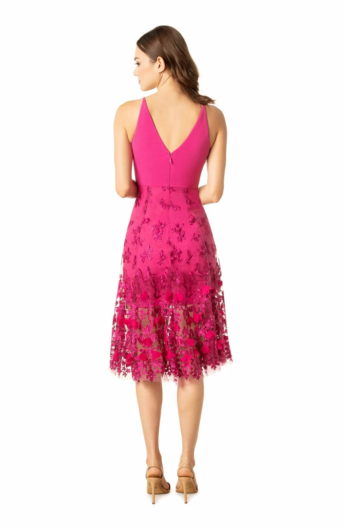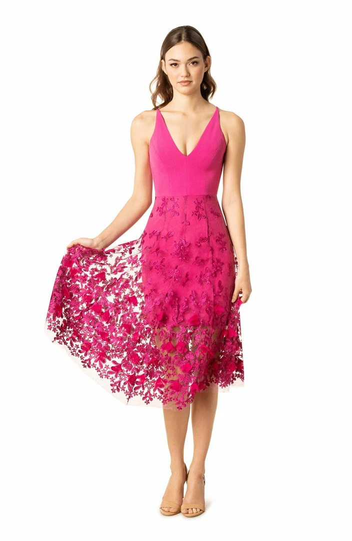 The feminine Darleen dress is form-fitting underneath a beautiful sheer fabric skirt with a floral design in Birght Fuchia. The slender straps and deep v-neckline makes this dress perfect for the spring and summertime. An elegant dress that proves beauty is in the details.