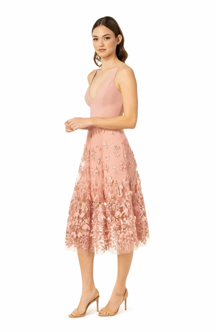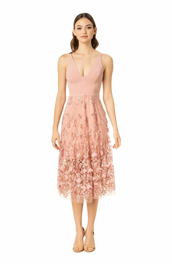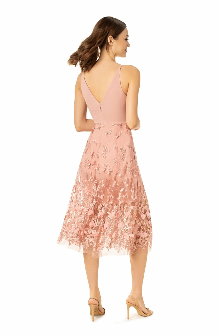 The feminine Darleen dress is form-fitting underneath a beautiful sheer fabric skirt with a floral design in Blush. The slender straps and deep v-neckline makes this dress perfect for the spring and summertime. An elegant dress that proves beauty is in the details.