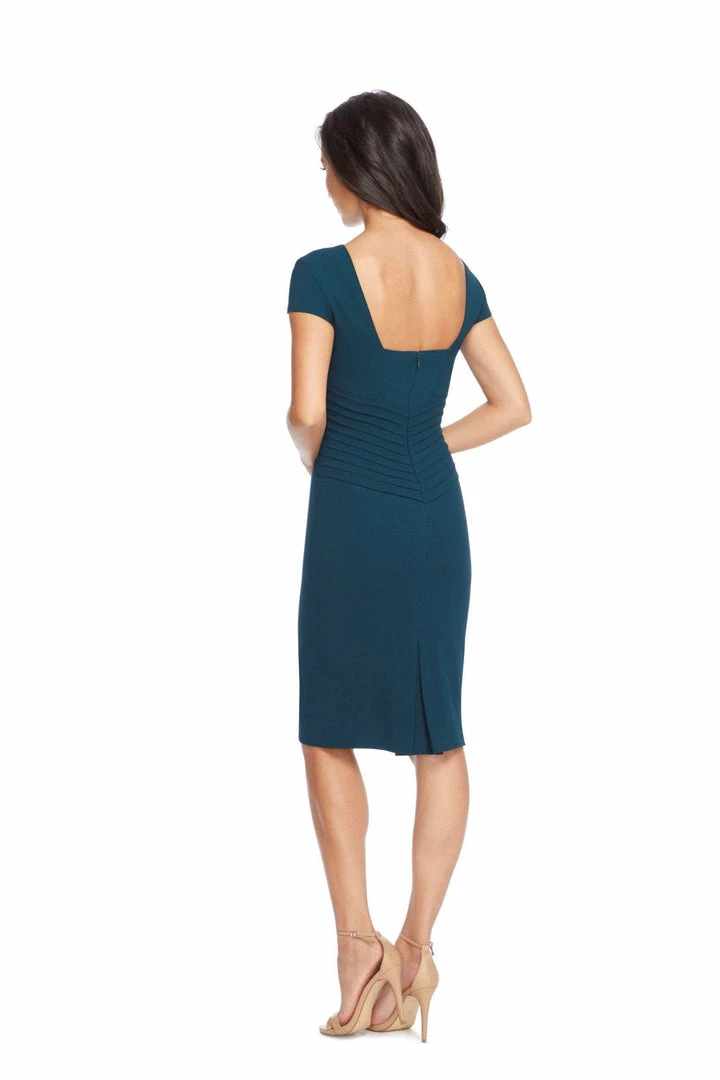 A crisscrossing band accentuates the waist of a sophisticated crepe sheath in Pine that will take you from the office to an event with ease.